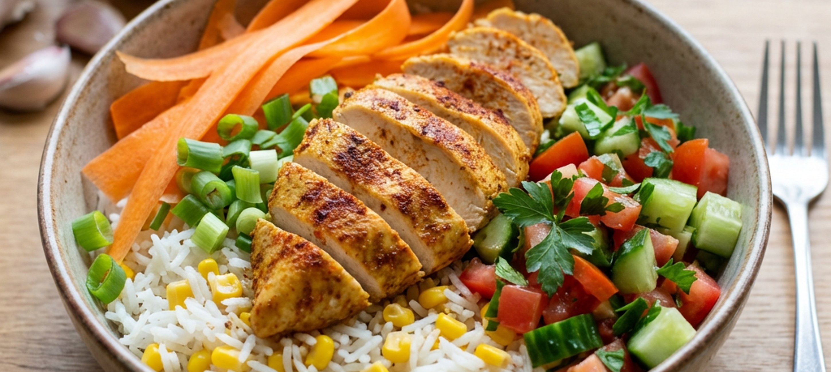 - 6Připravte si 2 mísy a rozdělte do nich uvařenou rýži s kukuřicí. Na rýži rovnoměrně rozprostřete plátky kuřecího masa, nastrouhanou mrkev, jarní cibulku a rajčatovou okurkovou směs a podávejte.