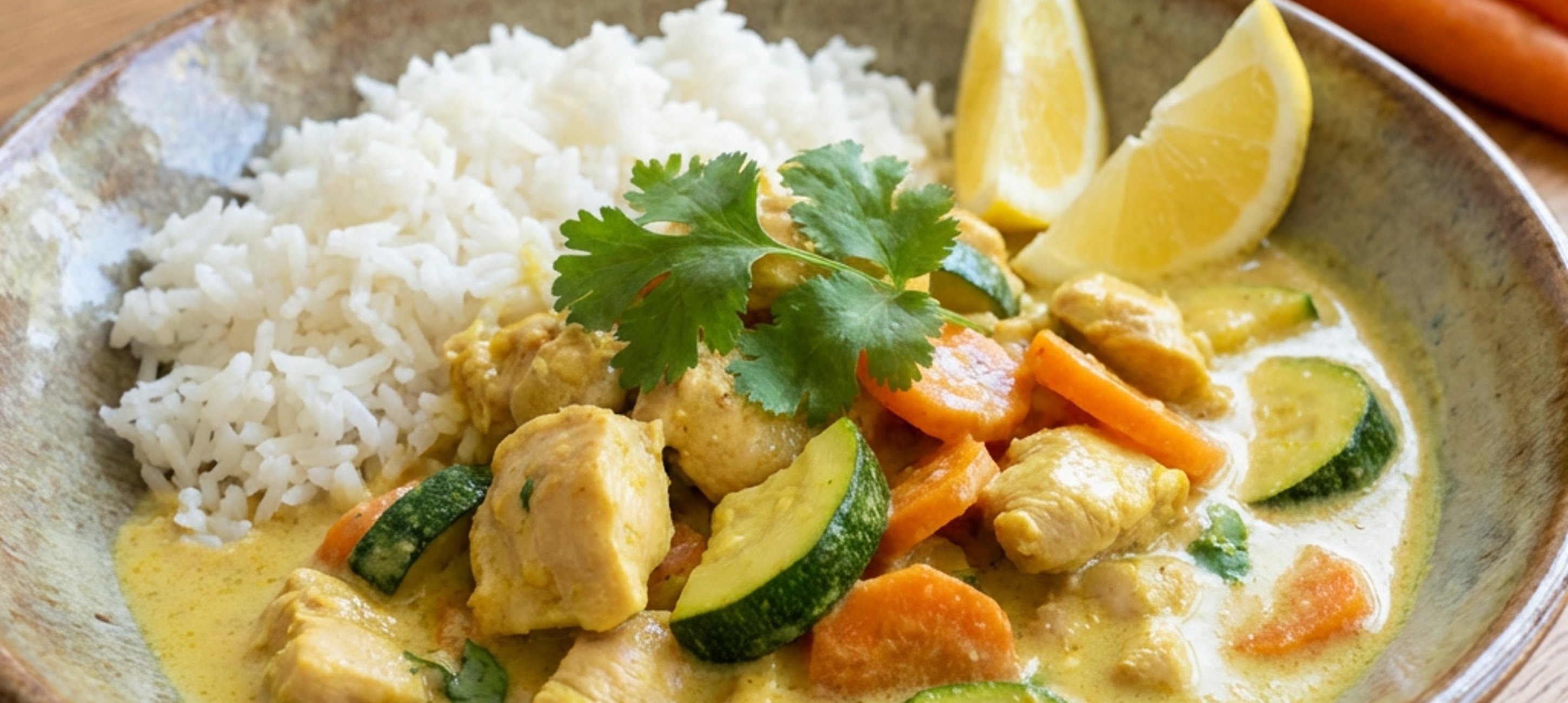 - 3Nakonec pánev odstavte z plamene, kuřecí kousky v kari omáčce dochuťte citronovou šťávou, solí a pepřem. Hotovou směs rozdělte na 5 porcí a podávejte.