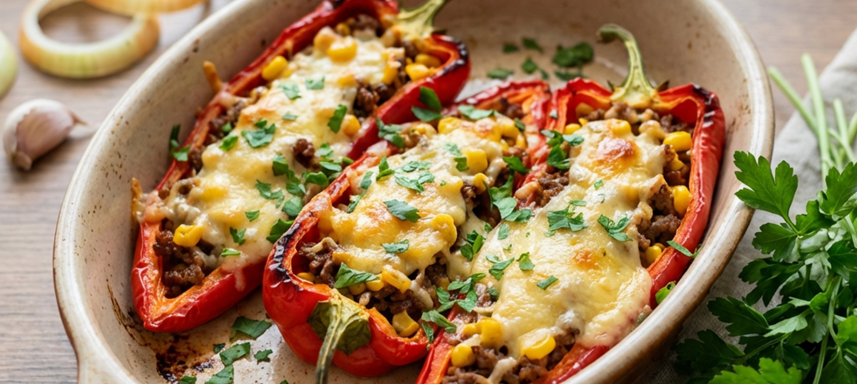 - 4Až se trouba vyhřeje, vložte do ní pečící nádobu a plněné papriky pečte 4–5 minut při 245–250°C, aby se rozpustil eidam. Zatím si najemno nakrájejte petrželovou nať.