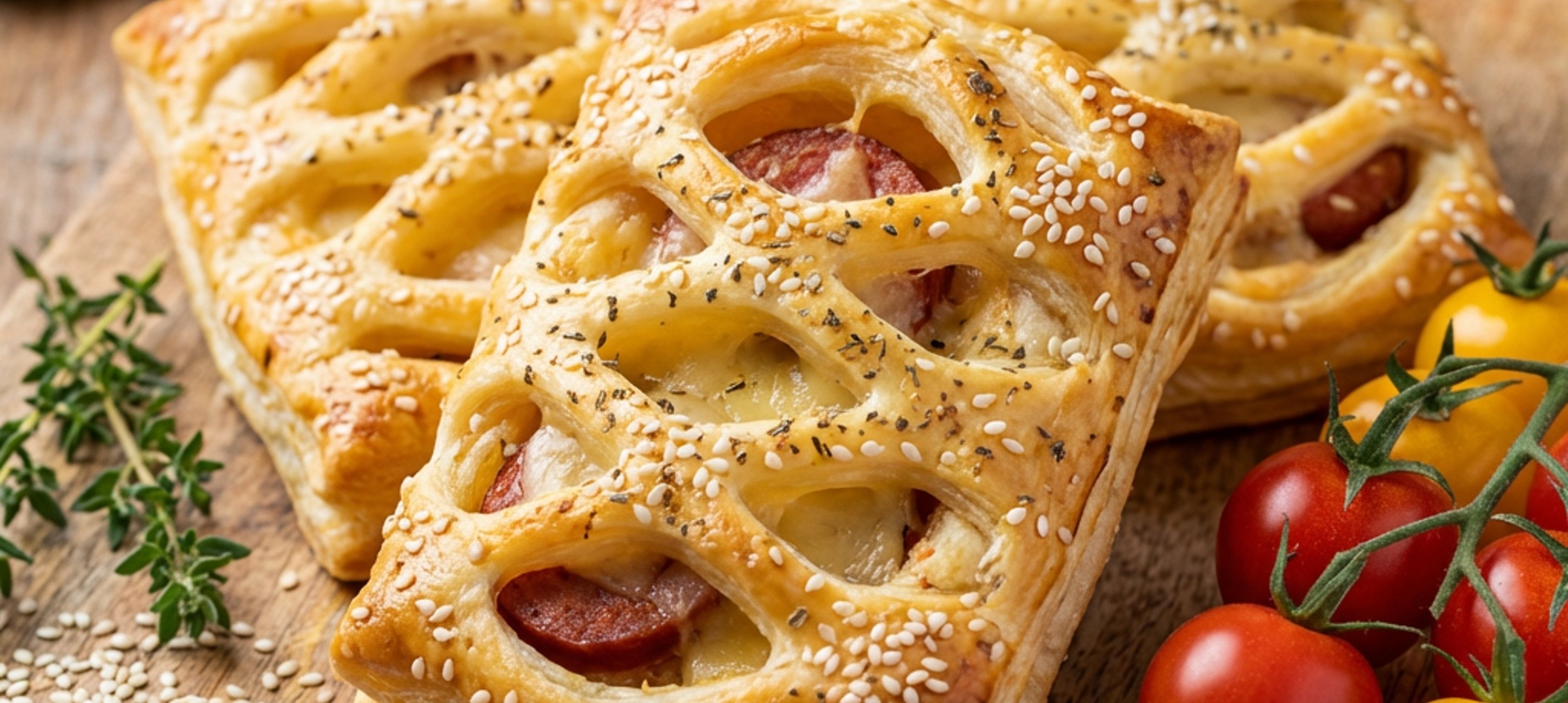 - 2Ostrým nožem je rozdělíme na 12 stejných menších obdélníků. 6 z nich potřeme kečupem, posypeme provensálským kořením a strouhaným sýrem. Dále poklademe na plátky nakrájené cherry rajčata, budou stačit 2 plátky. Nakonec položíme debrecínku seříznutou tak, aby nepřesahovala okraje