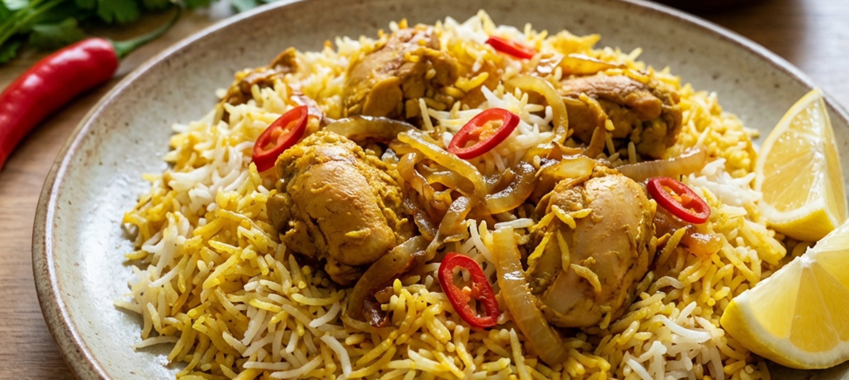 - 3K cibuli přidáme nakrájenou chilli papričku a na chvíli osmažíme. Nyní přidáme kokosové mléko a necháme ho zahřát. Do vroucího kokosového mléka přidáme předvařenou rýži a promícháme. Na vrch rýže položíme smažené kuřecí kousky. Zakryjeme poklicí a necháme biryani vařit na mírném ohni asi 5-10 minut, dokud se všechny chutě spojí a rýže je dokonale uvařená.
