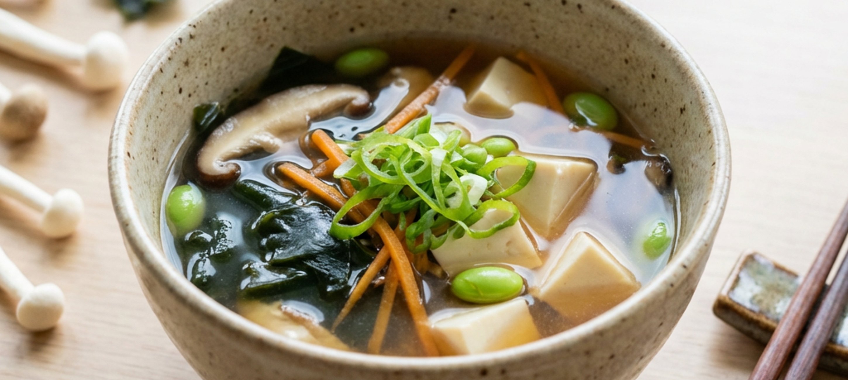 - 3Následně vývar scedíme a odstavíme z žáru. Přidáme miso pastu a dobře promícháme a již nevaříme.