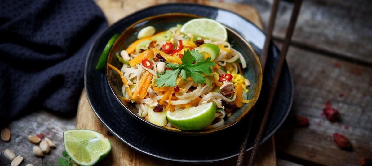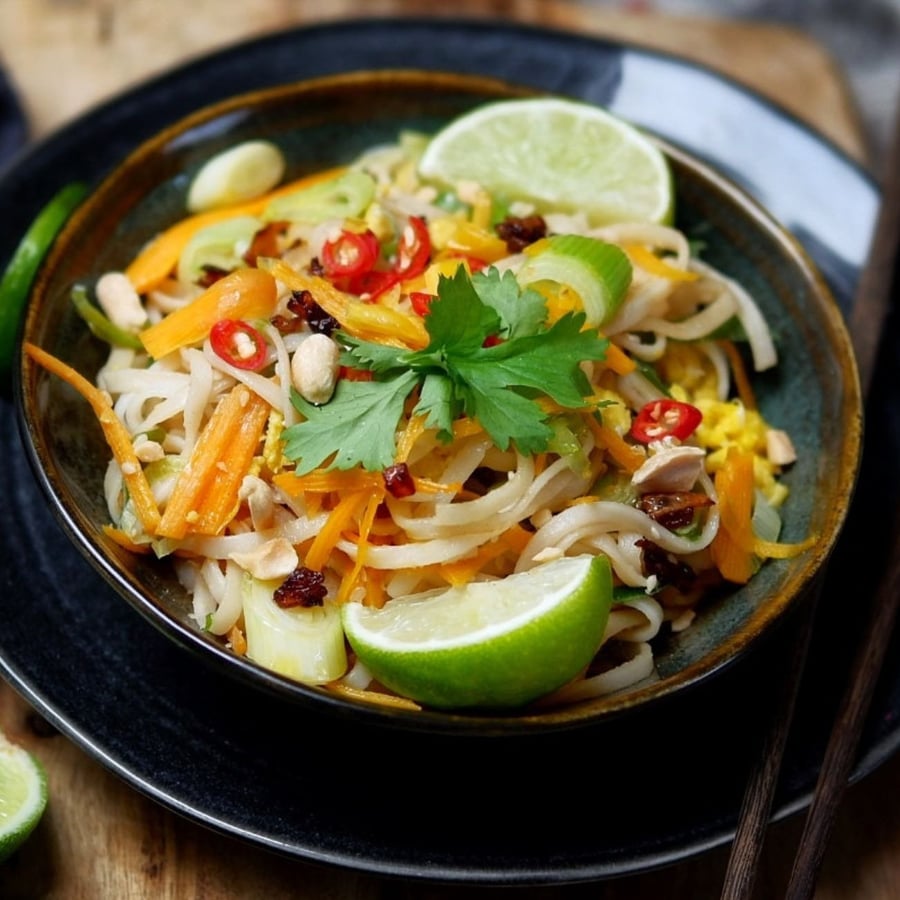 - 5Serve the noodles sprinkled with sesame seeds, unsalted peanuts, fried onions, freshly chopped coriander, and a wedge of lime for drizzling.