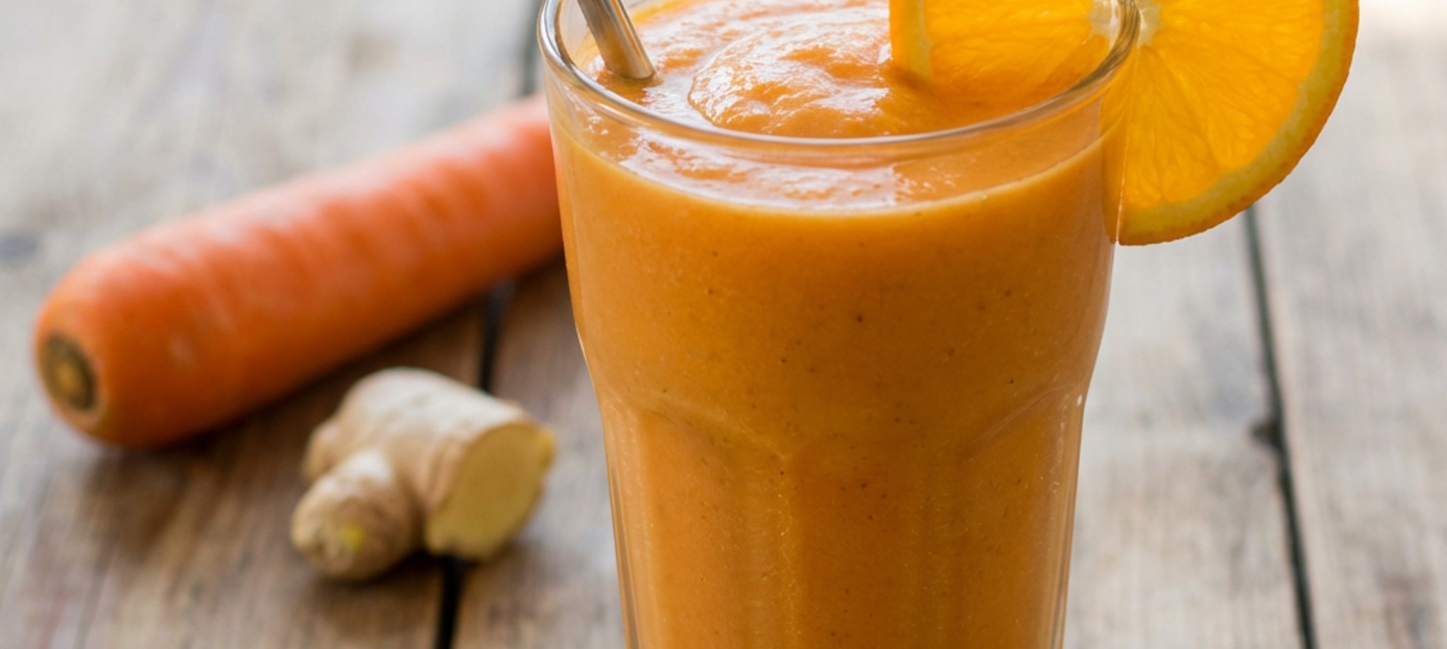 - 1Pomeranč a banán oloupejte. S mrkví vše nakrájejte a a dejte do mixéru. Nakonec přidejte mletý zázvor a kurkumu.