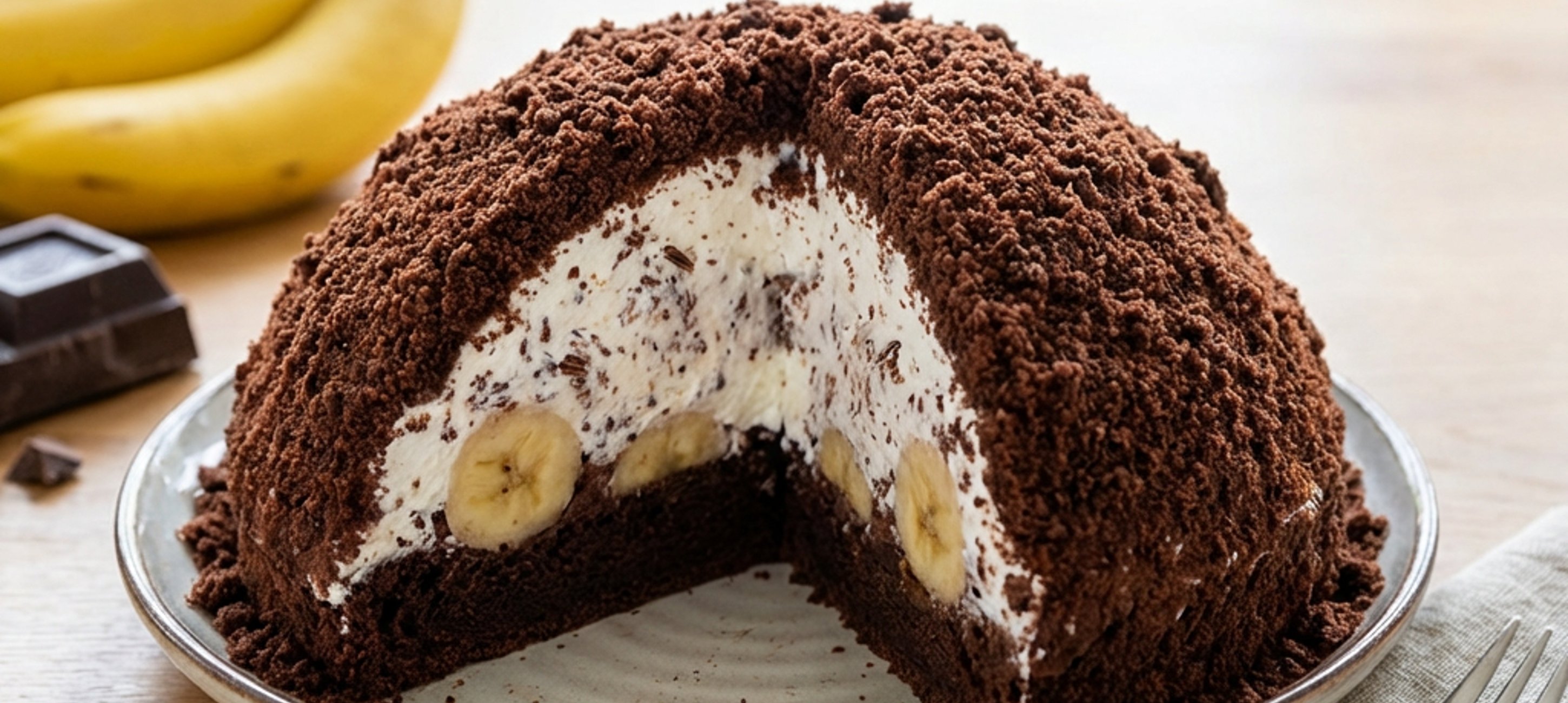 - 7Banány oloupejte, podélně rozpulte a naskládejte do vydlabaného dortového korpusu. Na banány naneste připravenou náplň a stěrkou ji uhlaďte tak, aby dort připomínal vypouklou polokouli. Následně po celém povrchu rozdrobte vydlabané těsto tak, aby náplň nikde neprosvítala. Takto připravený dort vložte alespoň na 3 hodiny do lednice.