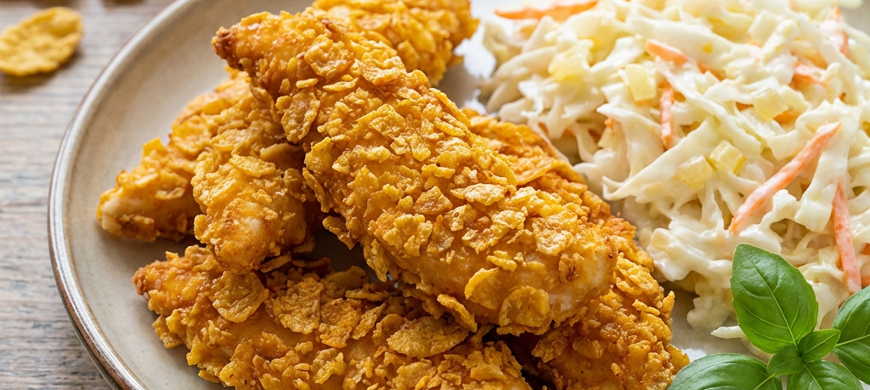 - 6Upečené stripsy rozdělte do 4 talířů a každou porci podávejte s připraveným coleslawem.