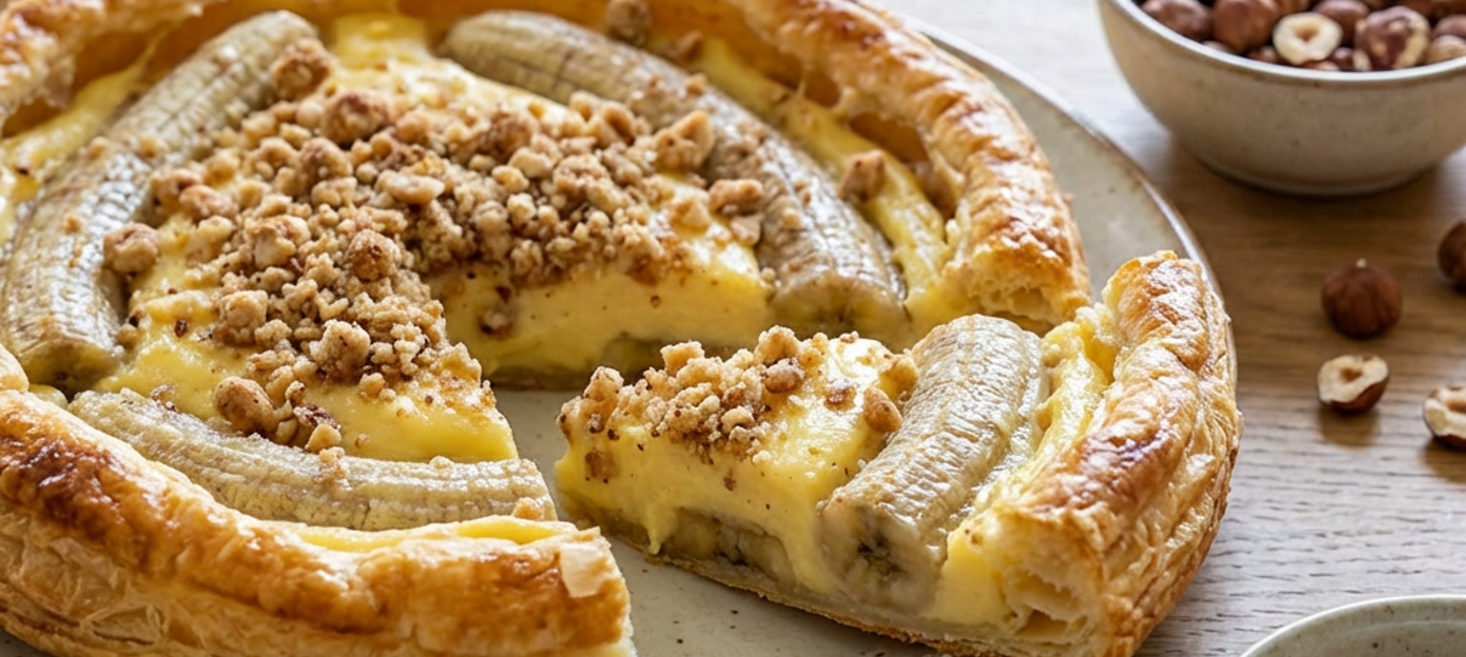 - 4Banány oloupejte, příčně rozpulte a naskládejte do formy na těsto.