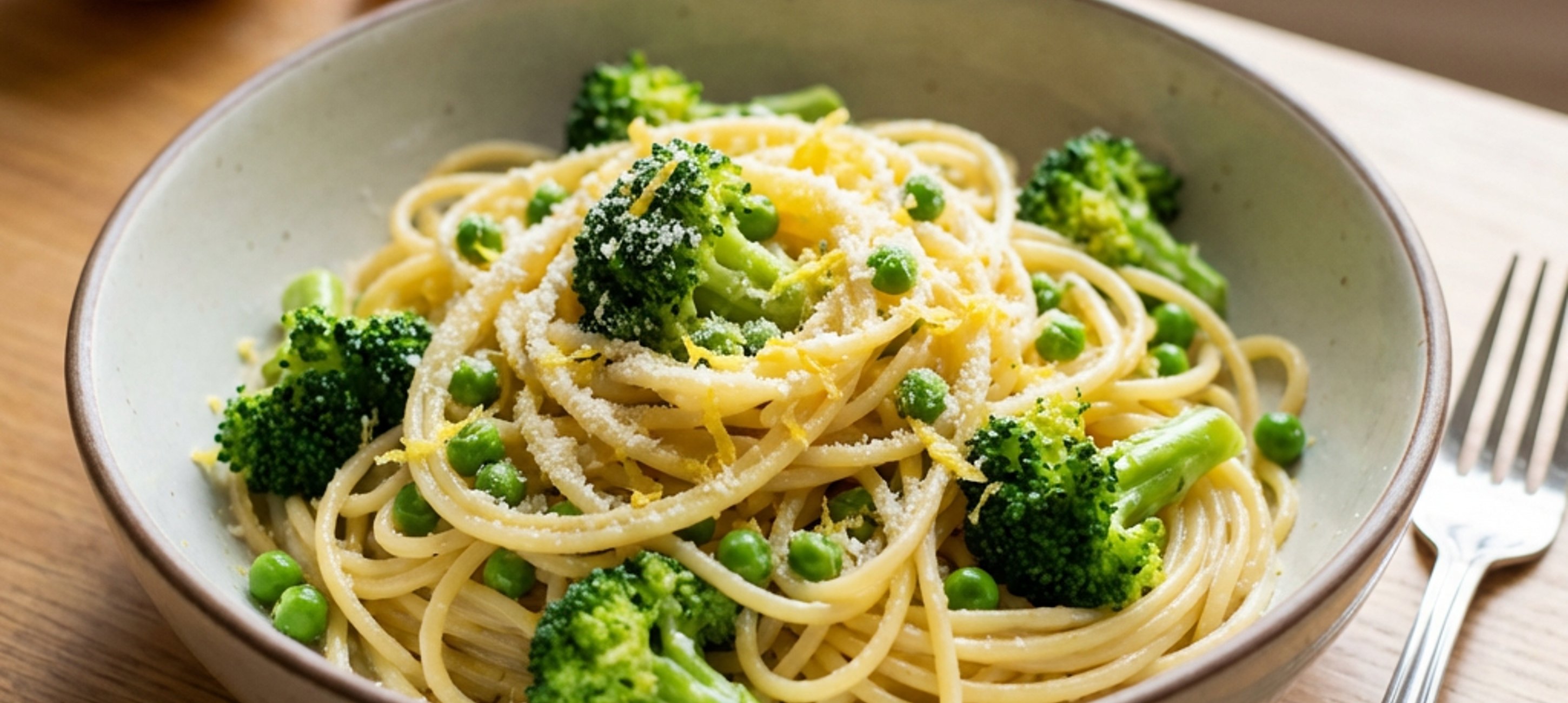 - 4Do hrnce přidejte parmazánovou směs z mísy a mražený hrášek a promíchejte. Poté do hrnce postupně přilévejte odebranou vodu ze špaget, aby se směs zjemnila a vytvořila omáčku (nemusíte přitom spotřebovat všechnu vodu).