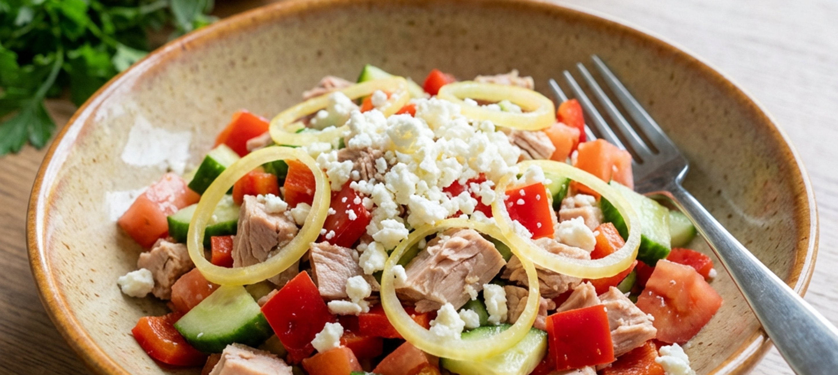 - 2Cibuli oloupejte a nakrájejte na kolečka. Papriku zbavte jádřince a společně s okurkou a rajčetem ji nakrájejte na malé kostičky. Všechnu nakrájenou zeleninu přidejte do mísy k tuňákové směsi a vše znovu promíchejte.