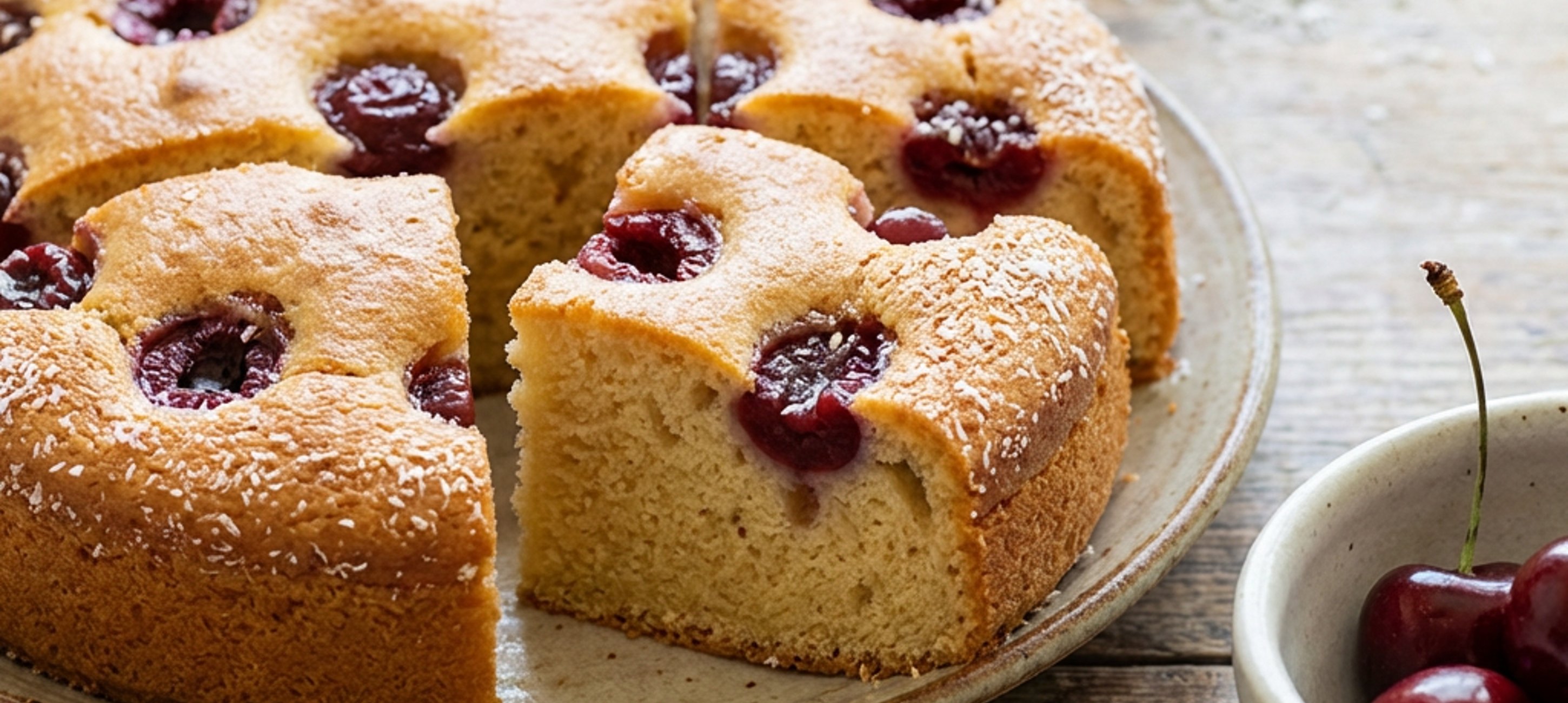 - 4Hotové těsto nalijte do připraveného pekáče a rovnoměrně ho rozprostřete po dně. Následně těsto rovnoměrně posypte třešněmi, které do těsta lehce zamáčkněte.