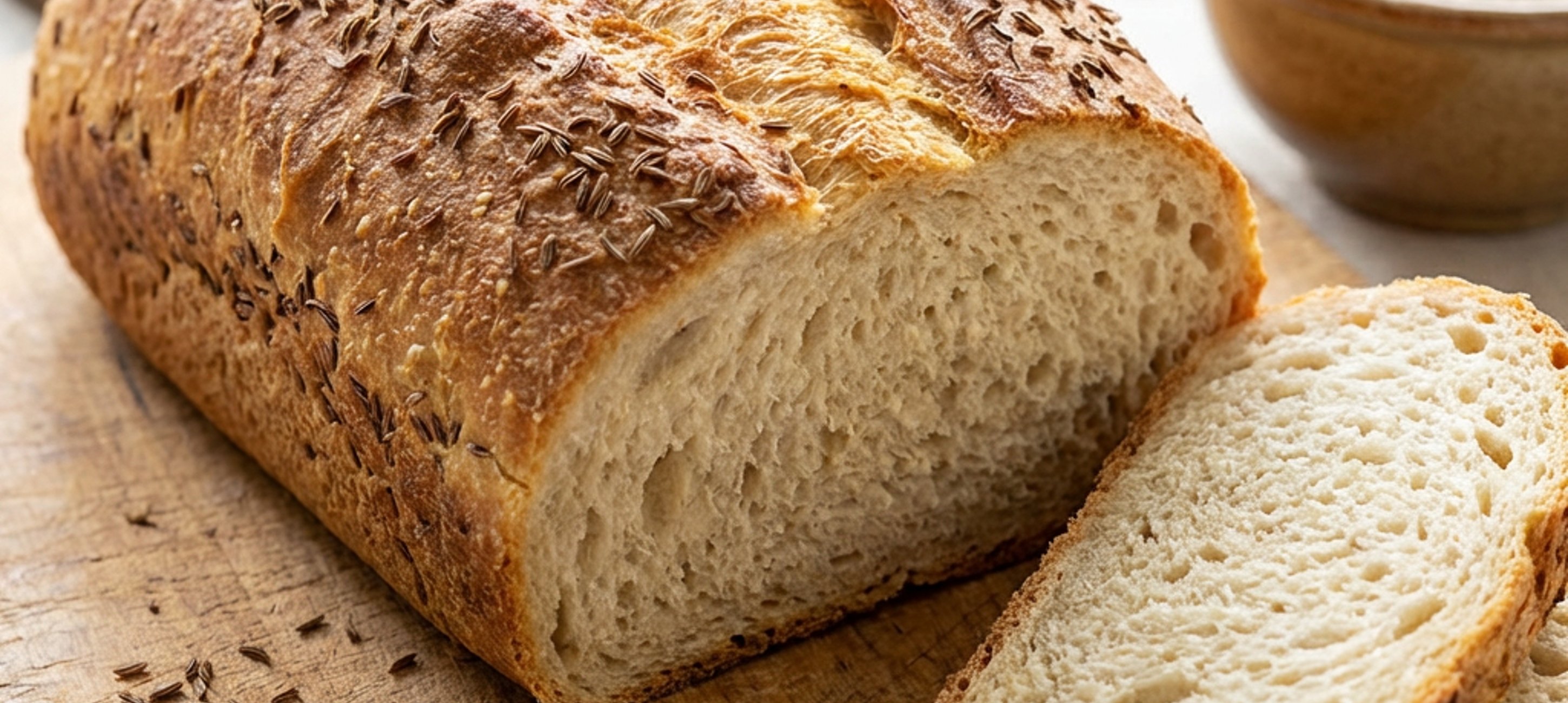 - 6Vykynutý chléb potřete vodou a posypte 1 lžičkou kmínu. Poté vložte plech do trouby a pečte 15 minut při 225–230 °C.