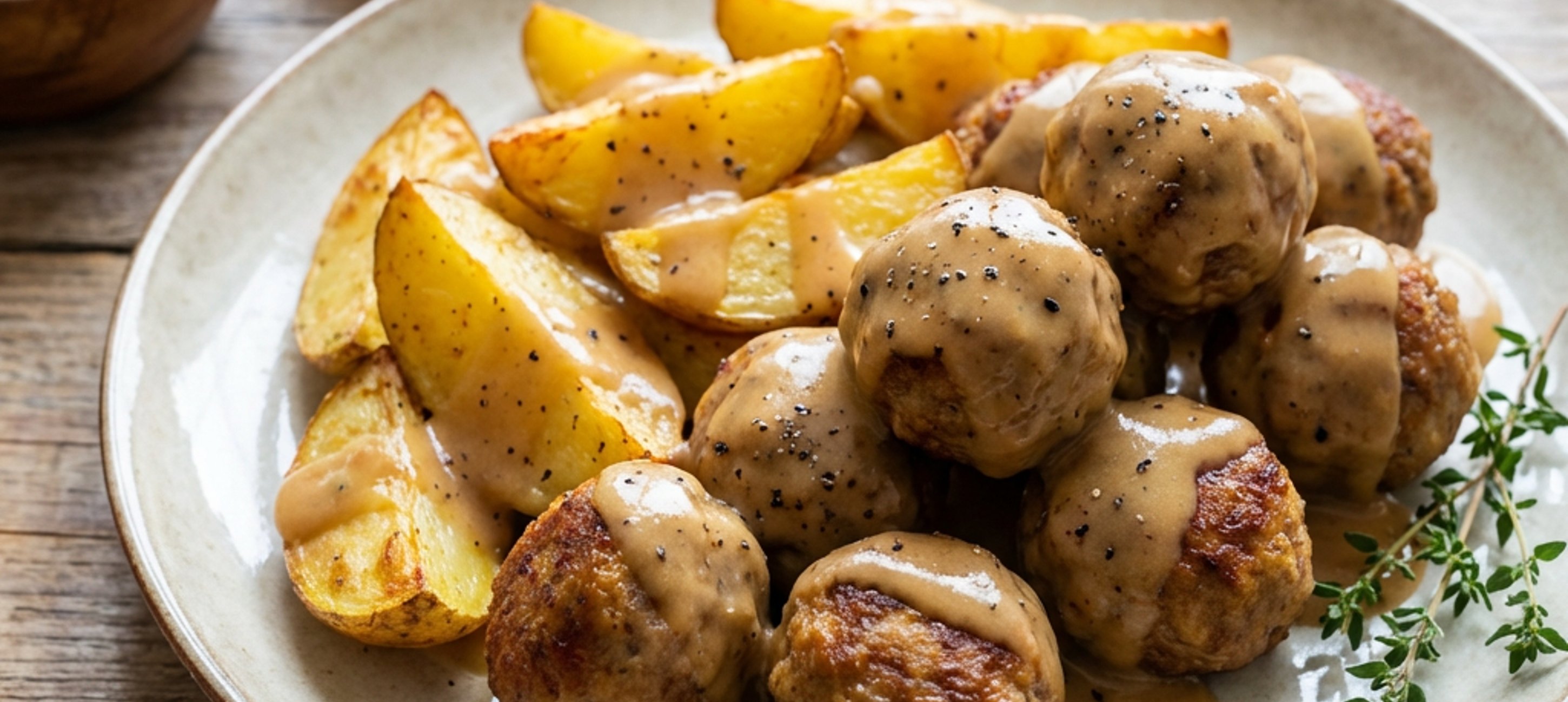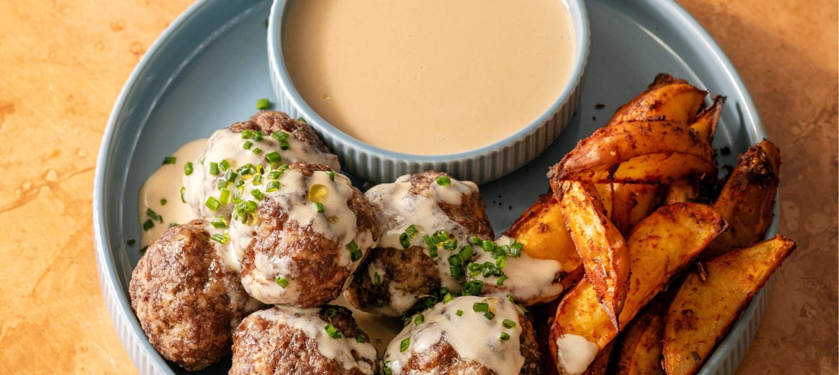 - 5Po 20 minutách pečení vyndejte z trouby plech s bramborami a brambory přesuňte na jednu stranu plechu. Na uvolněné místo vyskládejte masové kuličky, plech vraťte do trouby a vše pečte dalších 20–25 minut při 195–200 °C, dokud kuličky nezezlátnou.