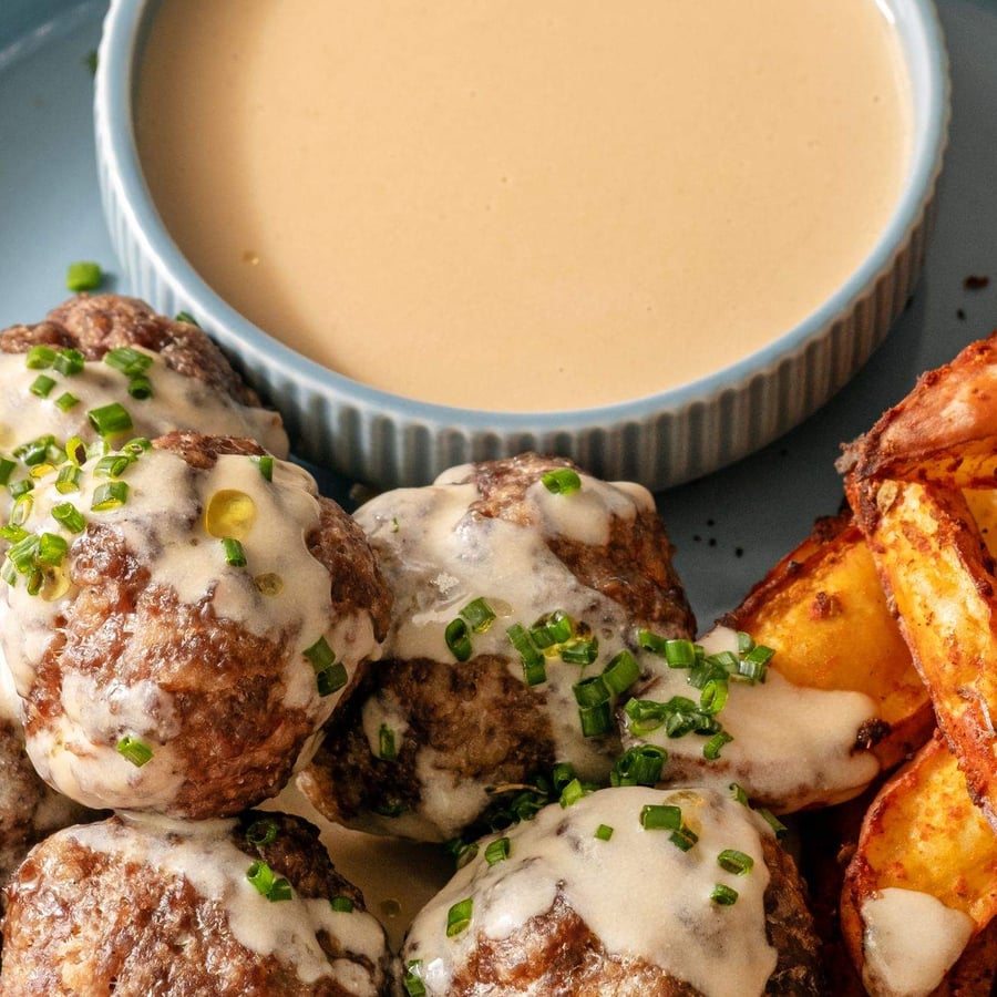 - 7Až se dopečou masové kuličky s bramborami, rozdělte je do 4 talířů. Následně každou porci polijte připravenou omáčkou a podávejte.