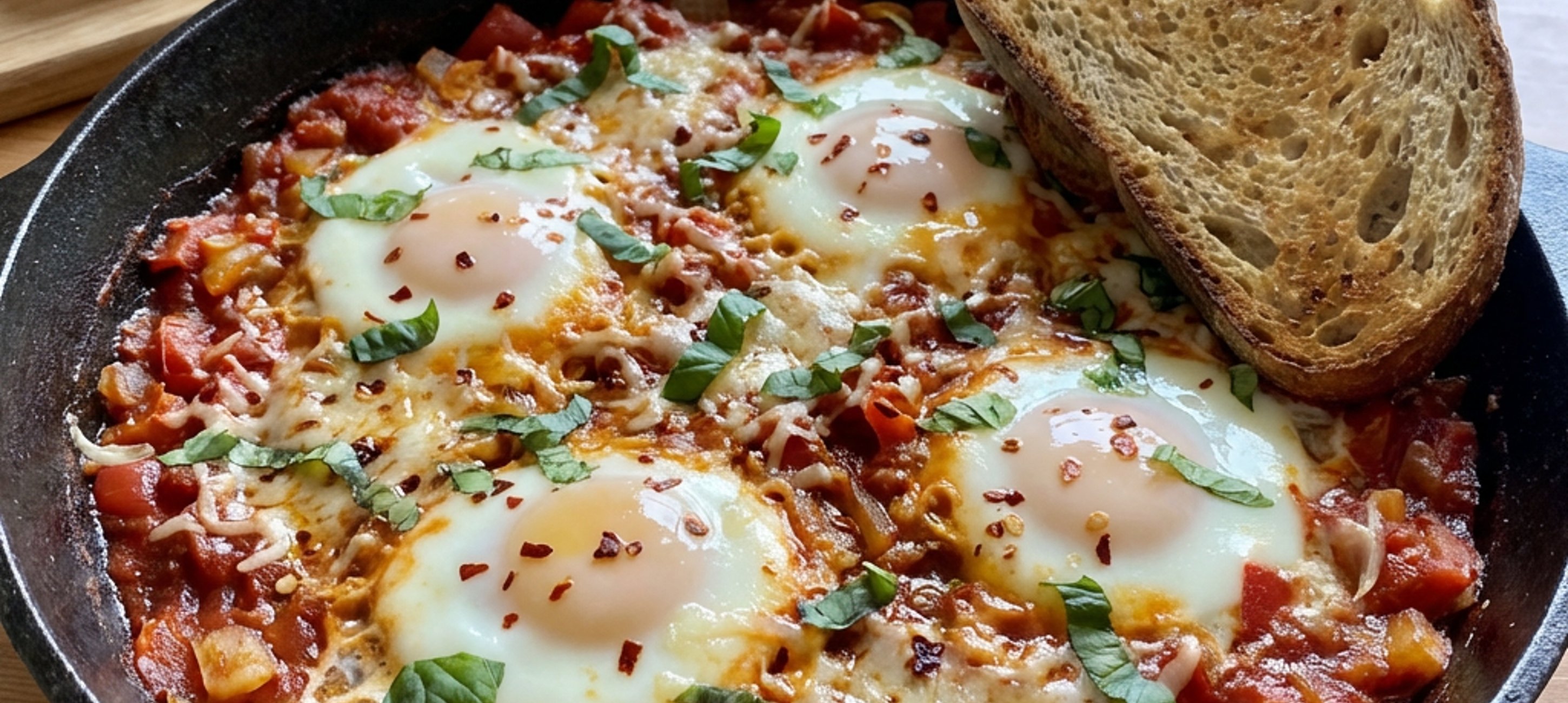 - 5Provařenou směs dochuťte solí a pepřem. Následně v ní vytvořte 4 důlky a do každého vyklepněte 1 vejce, které osolte a opepřete. Poté pánev přiklopte pokličkou a směs nechte vařit 5–7 minut na mírném plameni.