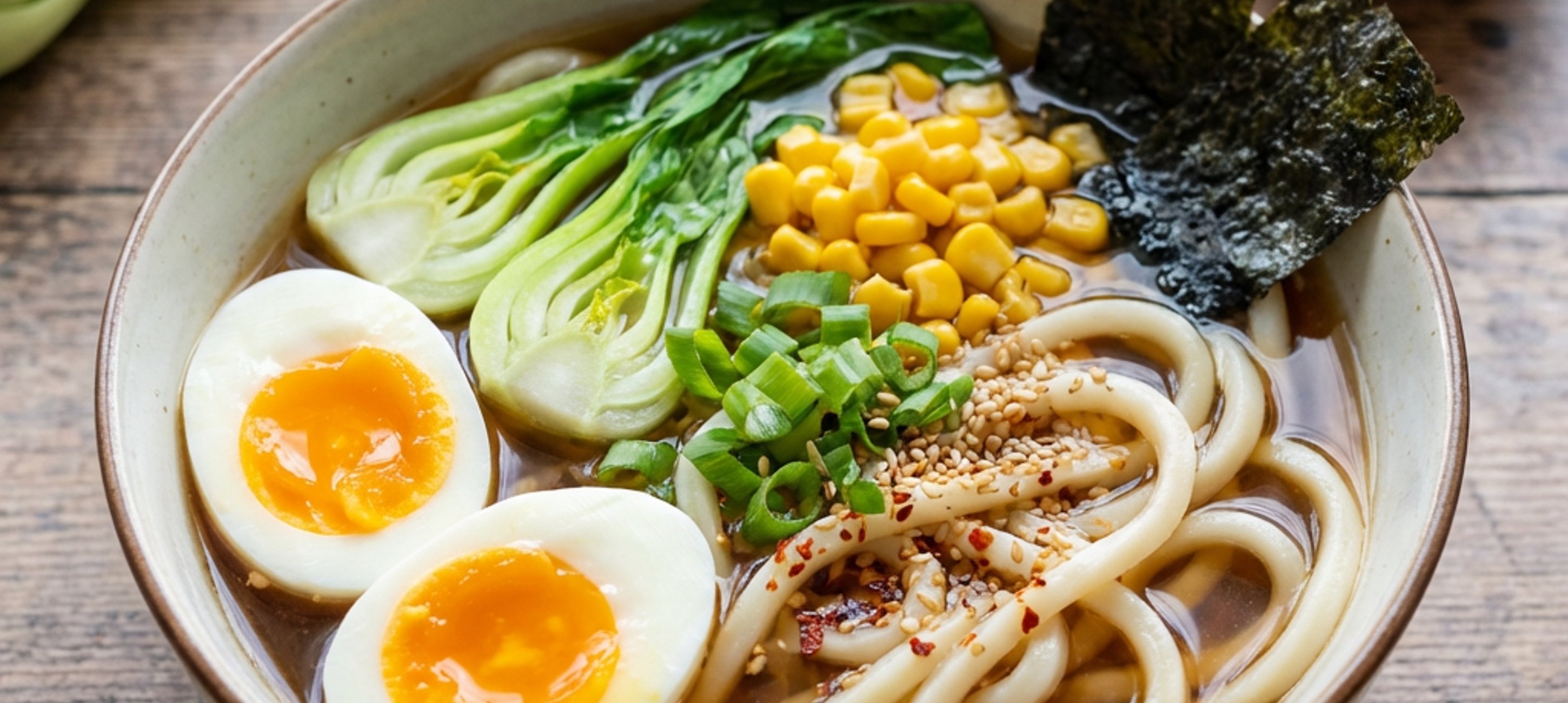 - 5Do misek dejte udon nudle, nasekanou jarní cibulku, vejce, kukuřici a řasu nori. Zalijte vroucím vývarem.