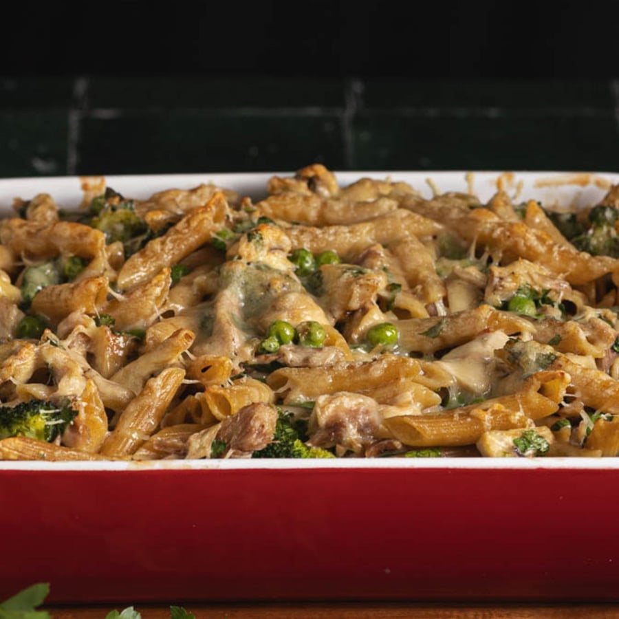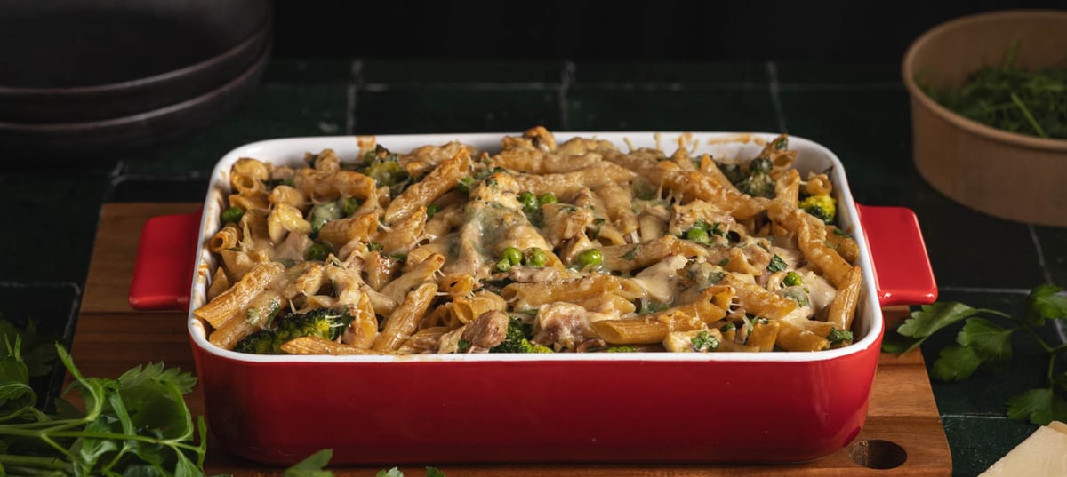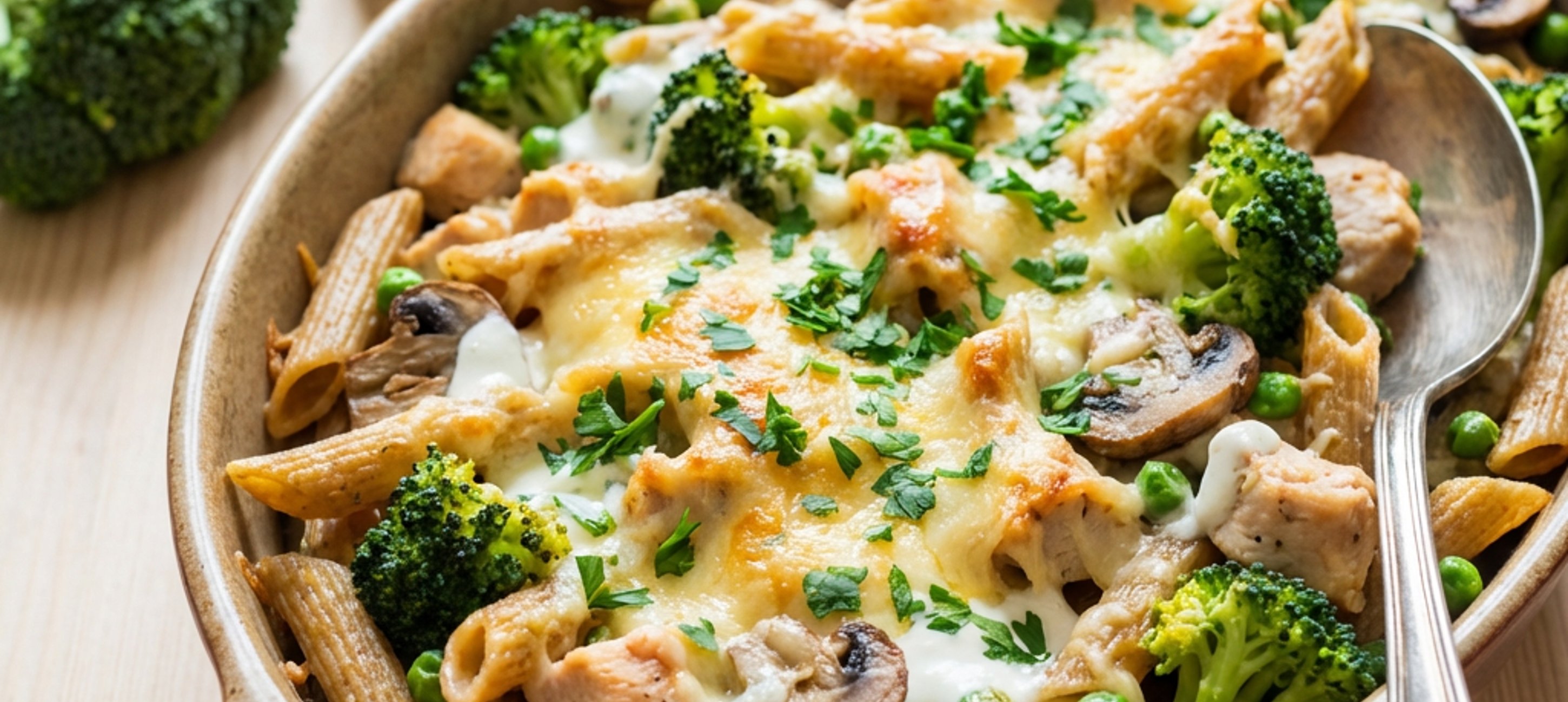 - 4Do pánve k žampionům vložíme těstoviny, kuřecí kousky, mražený hrášek, brokolici, zakysanou smetanu, nastrouhaný sýr, nasekanou petrželovou nať a 200 ml tekutiny z uvařených těstovin. Osolíme. Smícháme a dáme do pekáče o velikosti přibližně 20 x 30 cm. Posypeme strouhaným sýrem a pečeme 25 minut dozlatova.