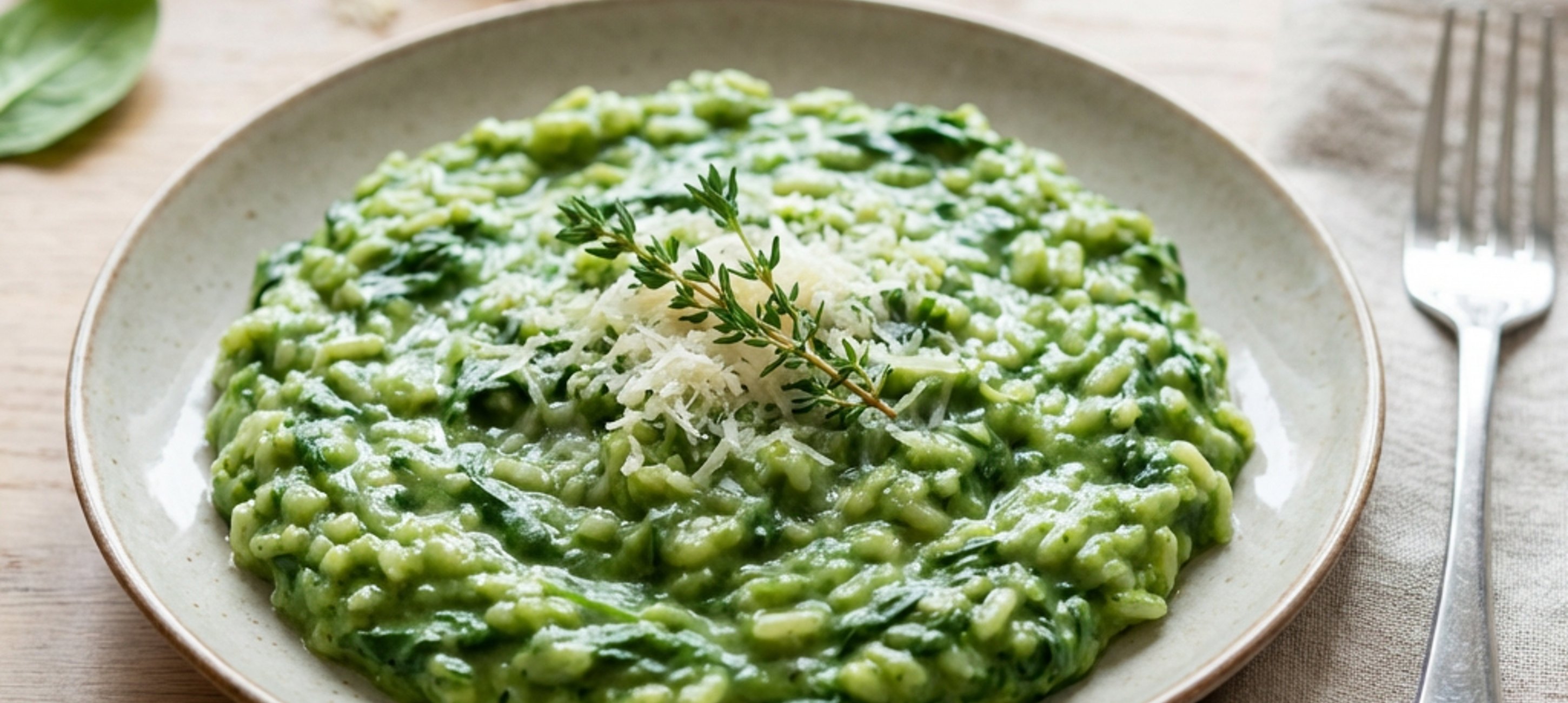 - 3Šalotku oloupejte, nakrájejte najemno a přidejte do pánve. Orestujte ji dosklovita, poté přidejte najemno nasekaný česnek. Vše restujte ještě zhruba 1 minutu. Přidejte rýži a za stálého míchání ji lehce orestujte. Zrnka rýže by měla začít sklovatět. Přidejte víno, čerstvý tymián, trochu soli a pepře. Zamíchejte a na mírném plameni nechte víno skoro zcela vyredukovat. Poté postupně do pánve přilévejte horký vývar. Vždy přidejte jednu naběračku, zamíchejte a počkejte až se skoro všechna tekutina vstřebá do rýže. Tímto způsobem postupujte až spotřebujete všechen vývar a rýže bude uvařená tzv. al dente. Poté pánev odstavte, přidejte špenátový krém, zbytek nastrouhaného parmazánu a také zbylé máslo nakrájené na kostičky. Vše dobře promíchejte do krémové konzistence.