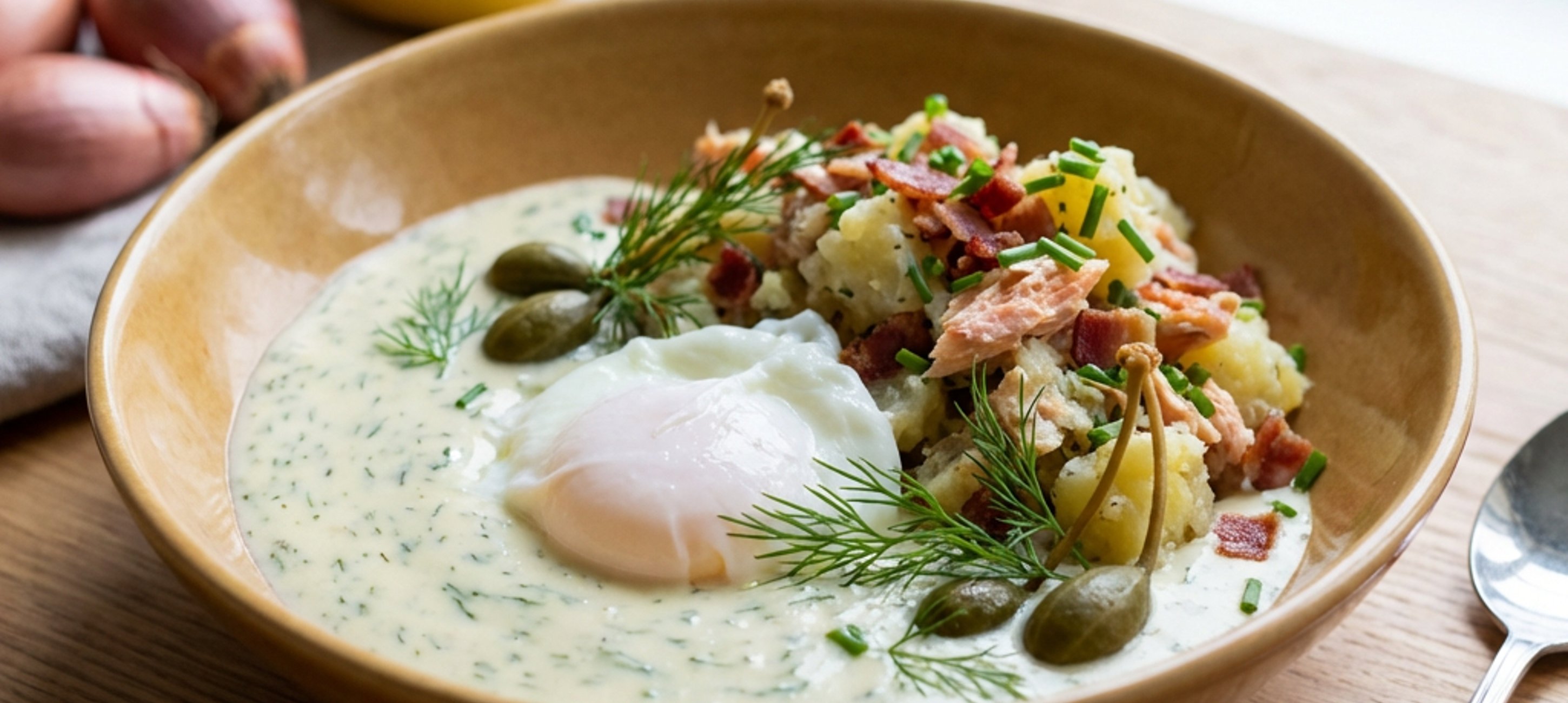 SUROVINY NA BRAMBORY SE PSTRUHEM A POŠÍROVANÝM VEJCEM