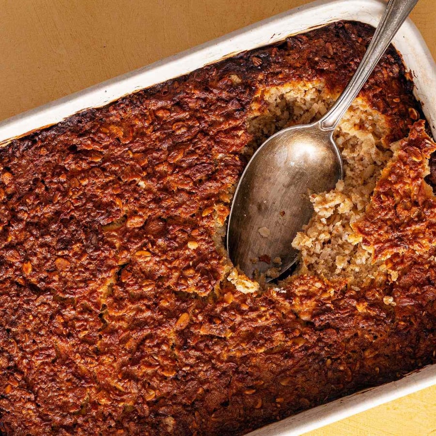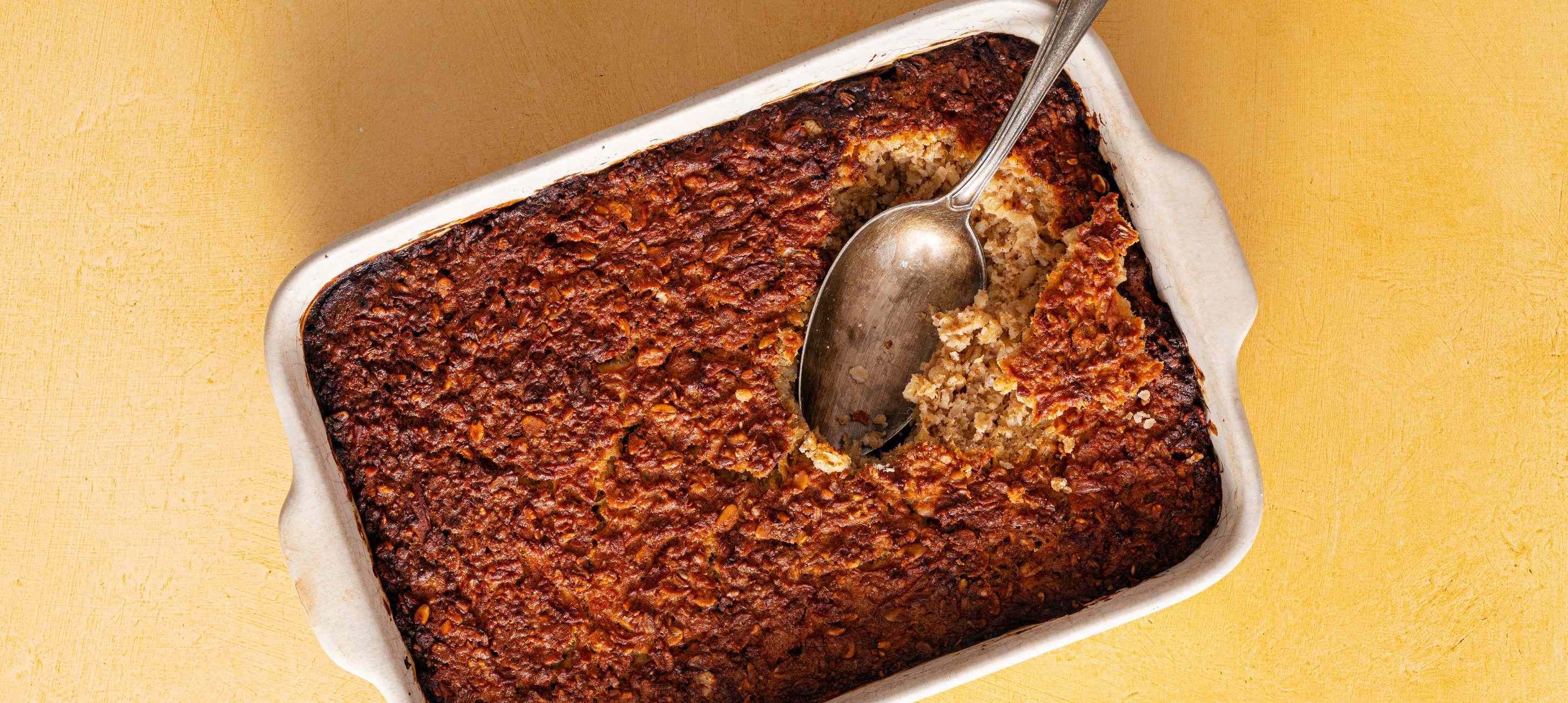 - 2Then take a larger bowl, add the oats, plain yogurt, honey, eggs, baking powder, cinnamon, and coconut oil, and whisk everything into a smooth batter. Next, wash the apples, grate them coarsely with the skin on, and mix them into the batter. Pour the resulting mixture into the baking dish and bake for 25–30 minutes at 180–190 °C.