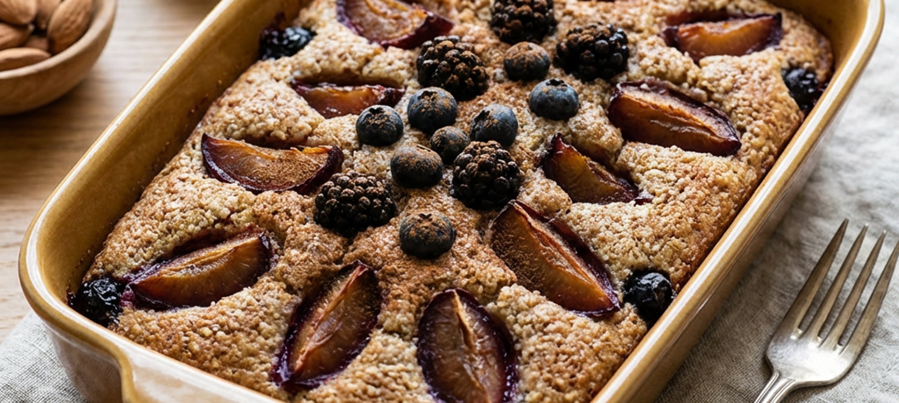 - 4Hotové těsto nalijte do vyložené zapékací formy a navrch rozprostřete připravenou ovocnou náplň. Formu vložte do trouby a pečte 30–35 minut při 170–180 °C.