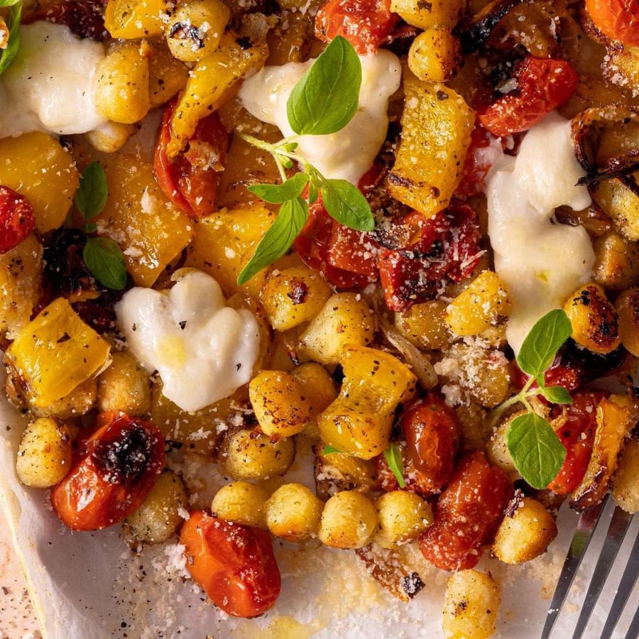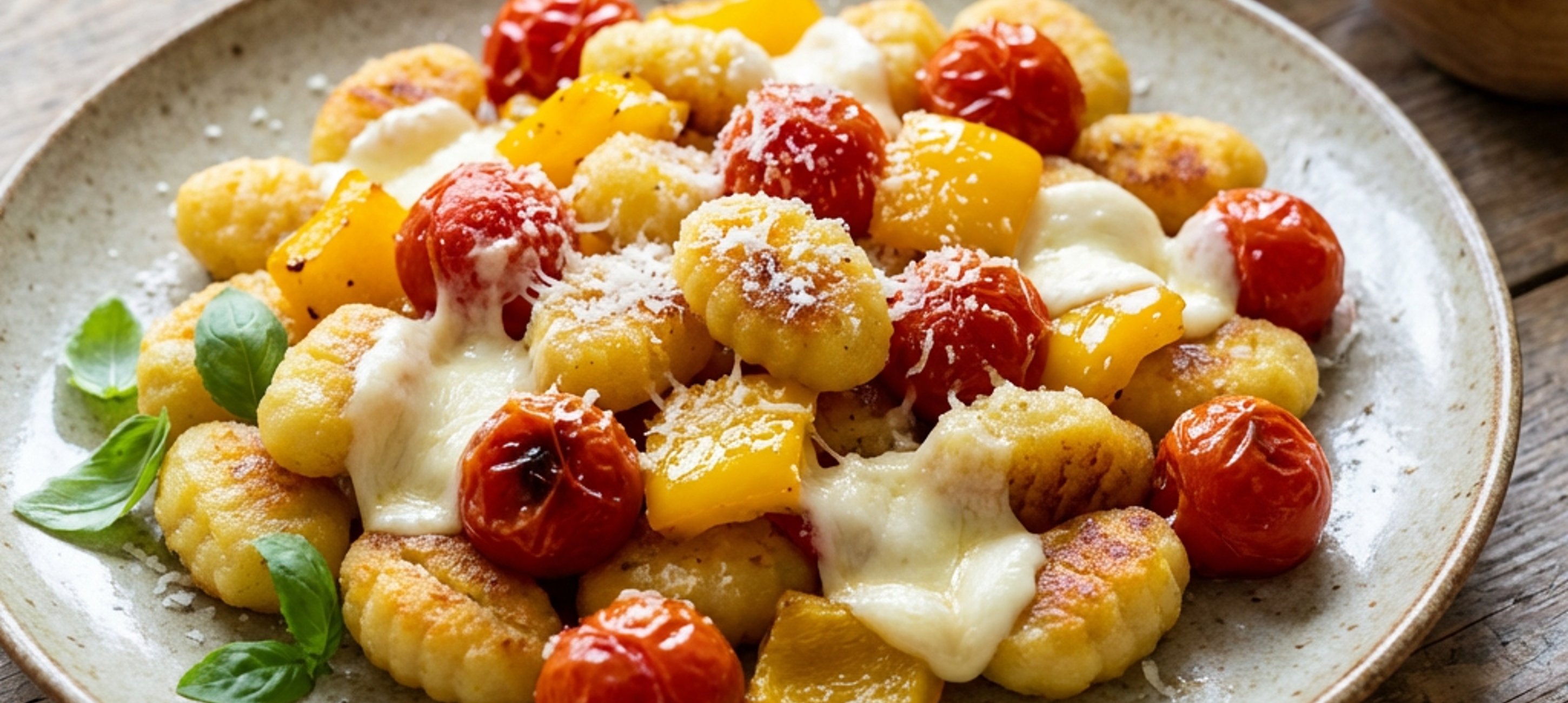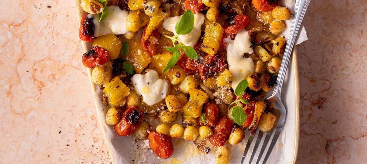 - 2Cibuli oloupejte a nakrájejte na hrubší plátky. Cherry rajčátka omyjte. Papriku omyjte, zbavte jádřince a nakrájejte na menší kousky (cca 2 cm × 2 cm). Česnek prolisujte a smíchejte ho s 1 lžící oleje a sušenou bazalkou. Všechnu zeleninu dejte společně s gnocchi na plech, zalijte olejem smíchaným s česnekem a bazalkou a pečte 15–20 minut při 210–220 °C.