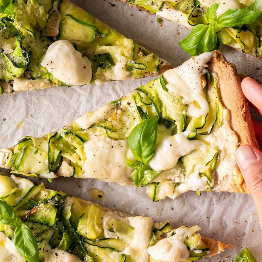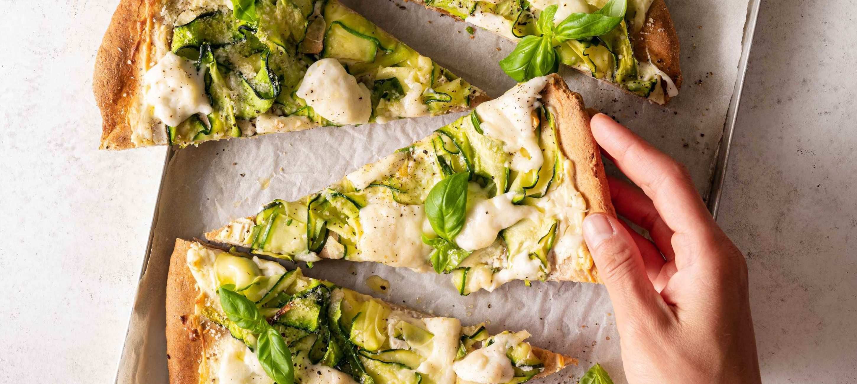 - 4Spread the risen dough on the lined baking sheet, place it in the oven, and bake for 10 minutes at 200–210 °C. Then remove the dough from the oven, spread it with the cream cheese and garlic mixture, arrange the squeezed zucchini on top, and drizzle everything with 2 tablespoons of olive oil. Return the pizza to the oven and bake for another 12 minutes at 200–210 °C. Meanwhile, tear the mozzarella into smaller pieces.