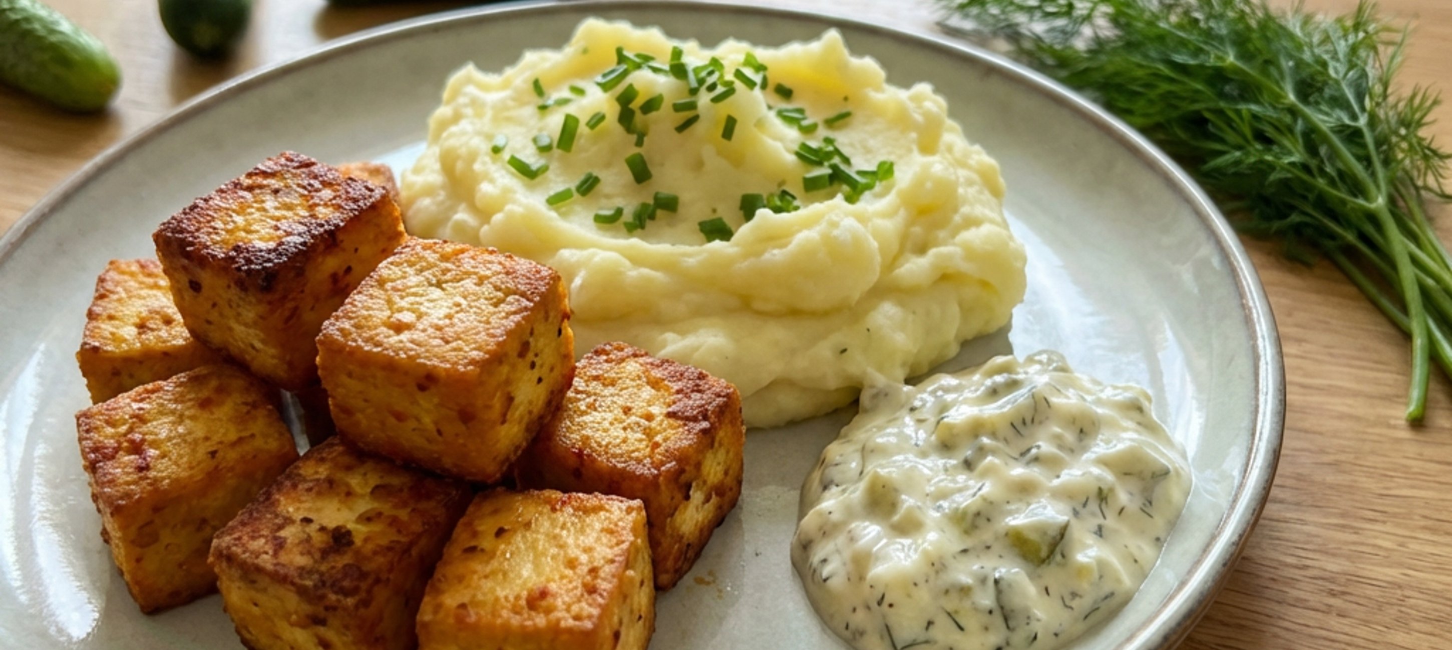 - 1Mezitím si připravte tatarku: Nakládané okurky a čerstvý kopr nakrájejte najemno. Cibuli oloupejte a také nakrájejte najemno. Všechny nakrájené ingredience dejte do středně velké misky, smíchejte s řeckým jogurtem, vinným octem a dijonskou hořčicí a dochuťte solí a pepřem. Hotovou tatarku dejte prozatím odležet do lednice, než připravíte tofu a kaši (minimálně ale na 10 minut).