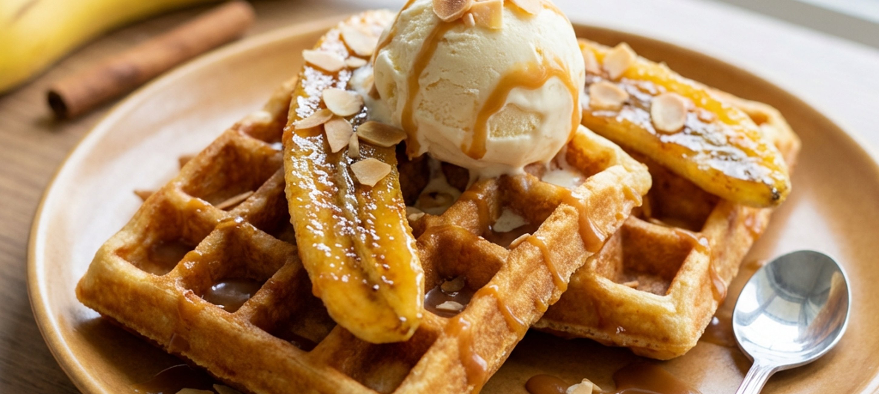 - 6Vafle položte na talíře, přidejte zkaramelizované kousky banánů a navrch dejte kopeček vanilkové zmrzliny Carte D'Or