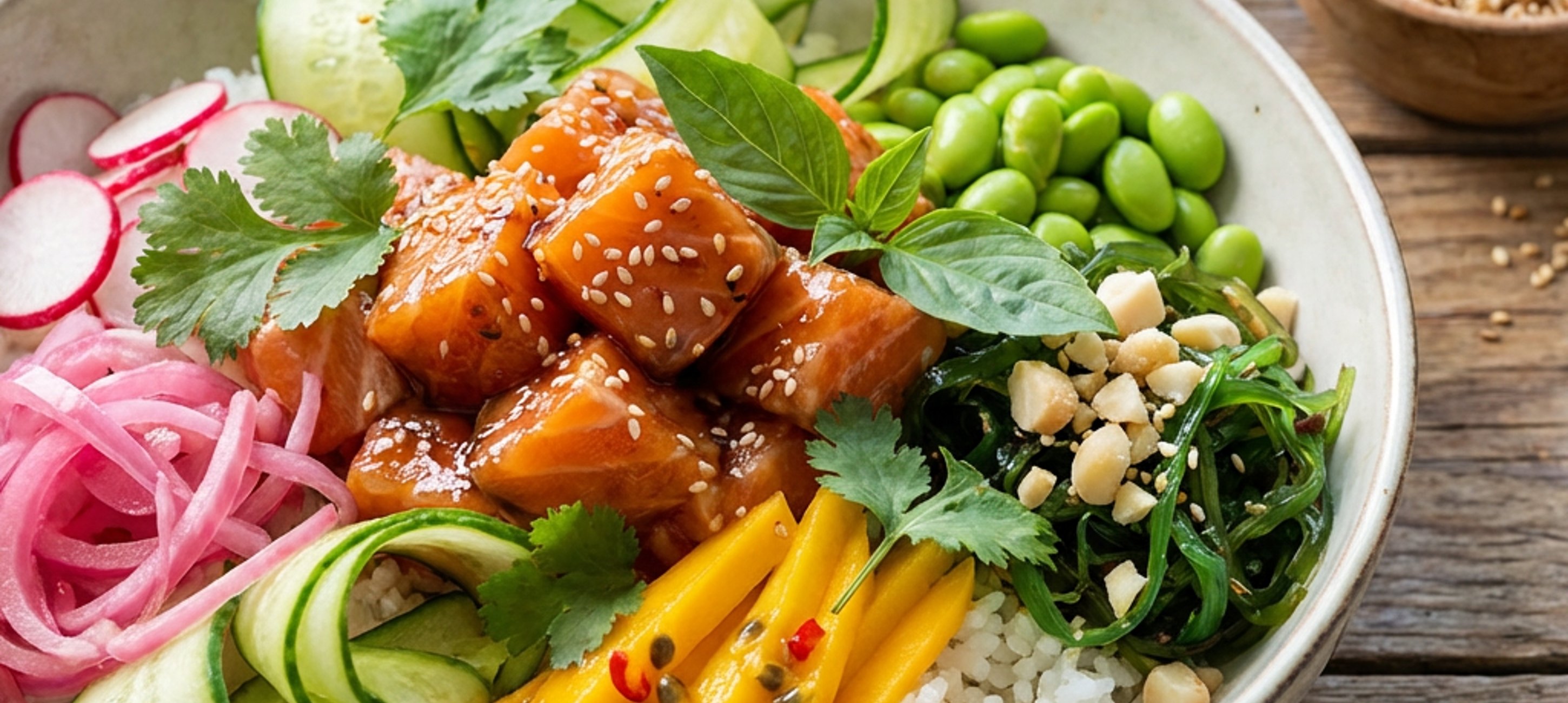 Do středu talíře dejte marinované kousky lososa a všechny ostatní složky postupně vyskládejte kolem.