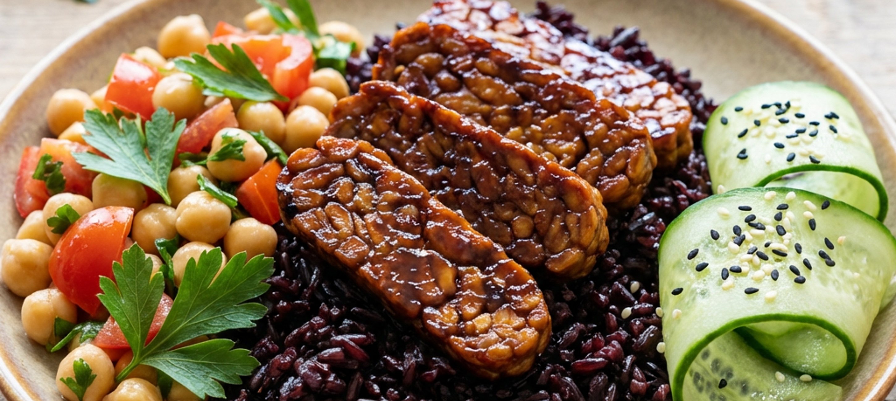 - 4Cizrnu propláchneme, přidáme 1 lžíci olivového oleje, rajčata nasekaná najemno a nasekanou petržel. Osolíme a opepříme. Okurku oloupeme na nakrájíme na plátky za pomocí škrabky na brambory. Osolíme, opepříme a posypeme sezamovými semínky.