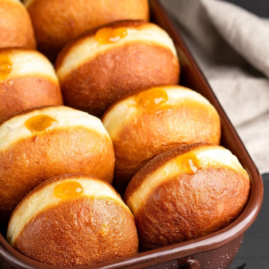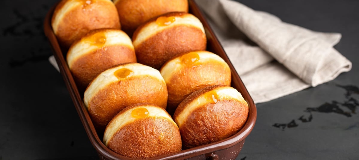 - 1Place all ingredients except for the oil and jam into the bowl of a kitchen mixer. All ingredients should be at room temperature, so take the milk and eggs out of the fridge at least 2 hours before preparation. The butter must be softened. If you like, you can also add 1 tablespoon of quality rum.