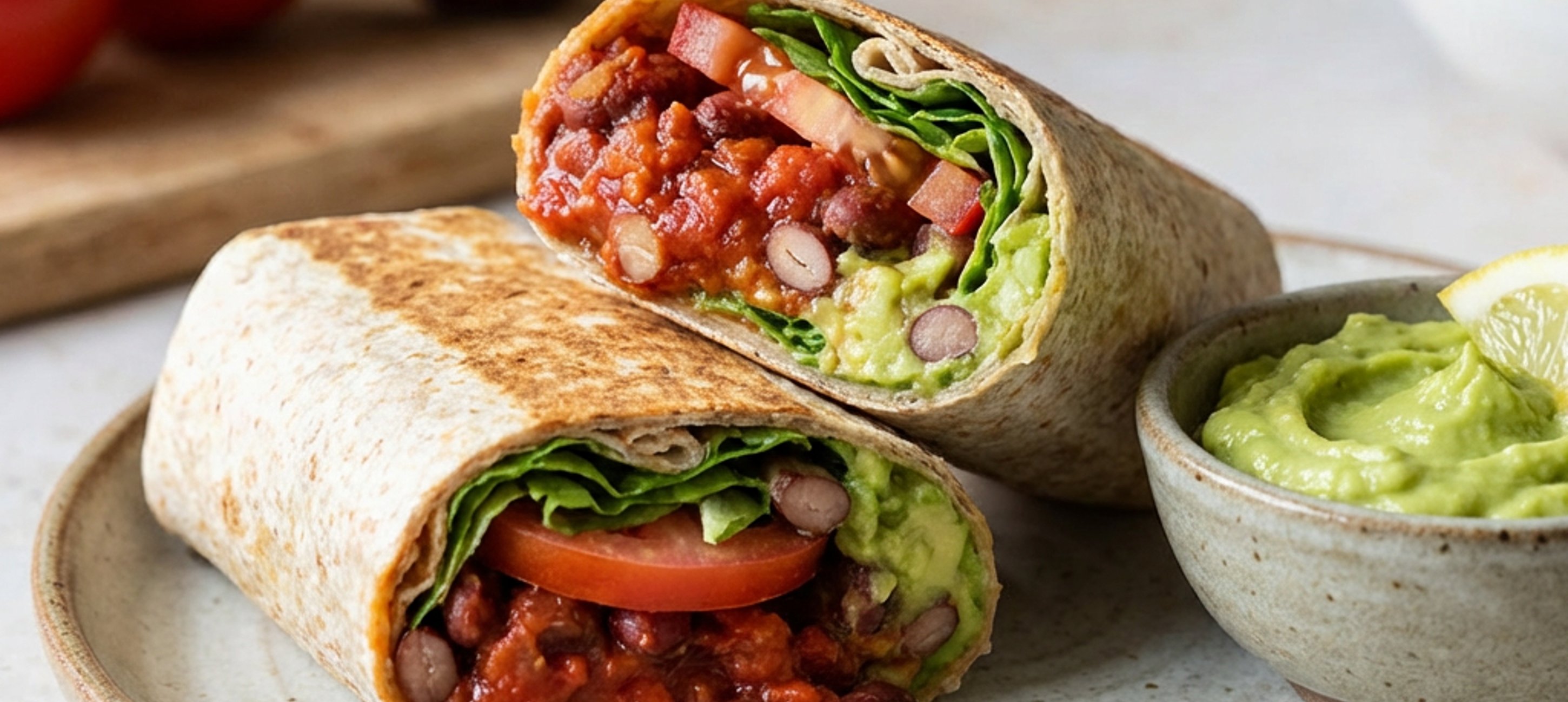 - 4Na tortillu poklademe natrhaný či nakrájený salát, fazolovou směs, rozmačkané avokádo a na plátky nakrájená rajčata. Opatrně zabalíme a burrito opečeme na pánvi z obou stran.