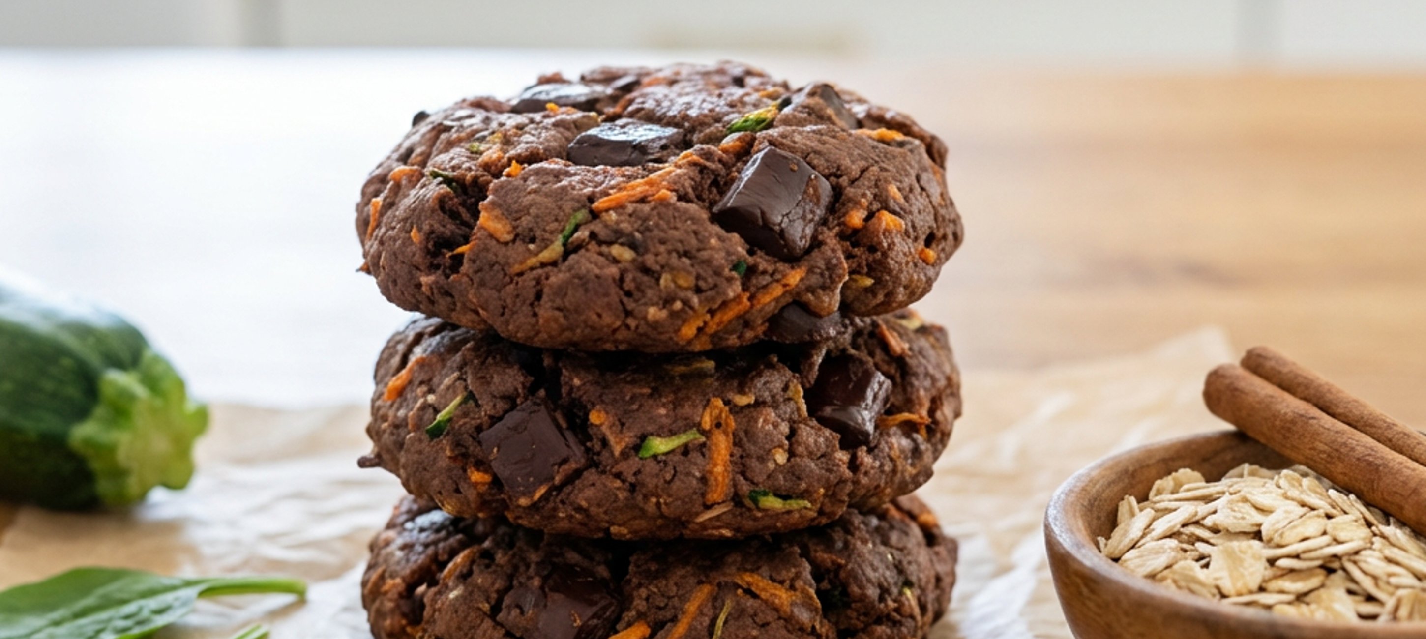 - 2Mrkev oloupejte, cuketu omyjte a obojí najemno nastrouhejte do větší mísy. Baby špenát propláchněte pod studenou vodou, nakrájejte najemno a přidejte do mísy společně s jablečným pyré, medem a 1 vejcem. Obsah mísy promíchejte, přidejte pšeničnou mouku, ovesné vločky, holandské kakao, prášek do pečiva a skořici a ze směsi vypracujte hladké těsto. Nakonec si nahrubo nasekejte čokoládu a přimíchejte ji do těsta v míse.