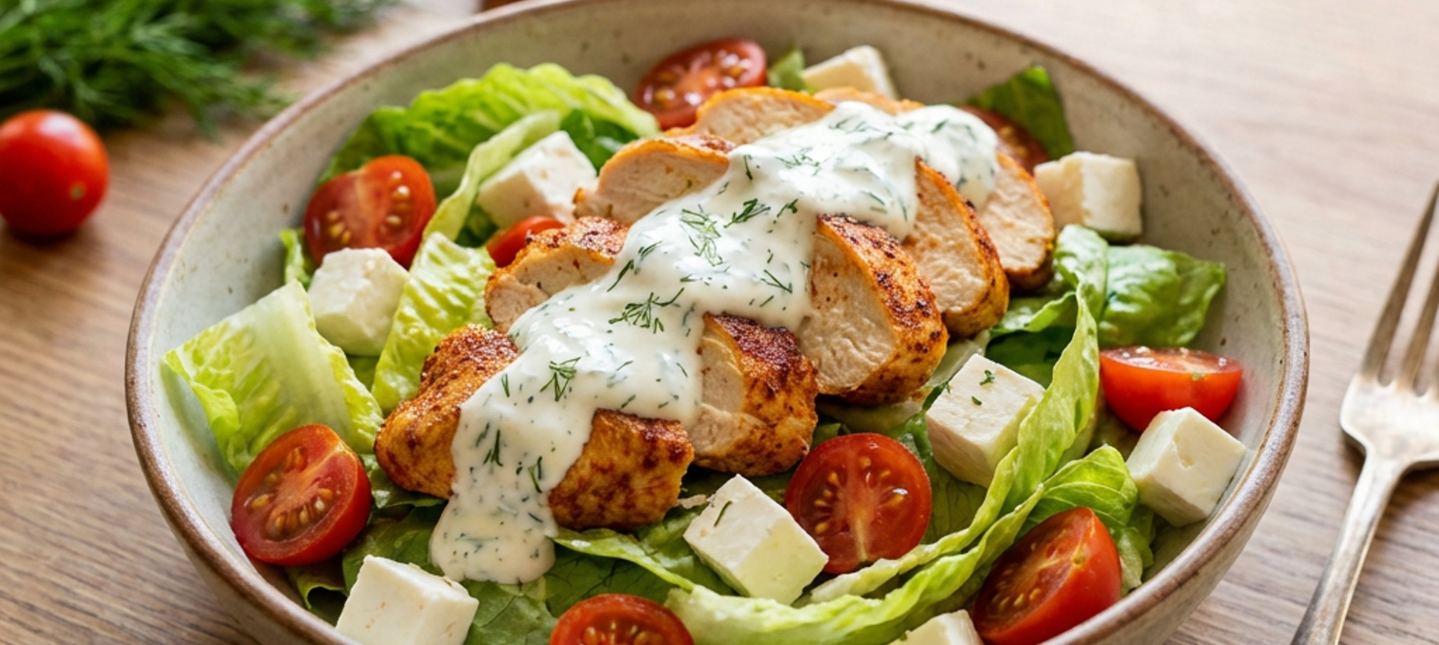 - 6Salát z mísy rozdělte na 4 porce a ke každé přidejte plátky pečeného masa. Nakonec každou porci salátu přelijte jogurtovým dresinkem a podávejte.