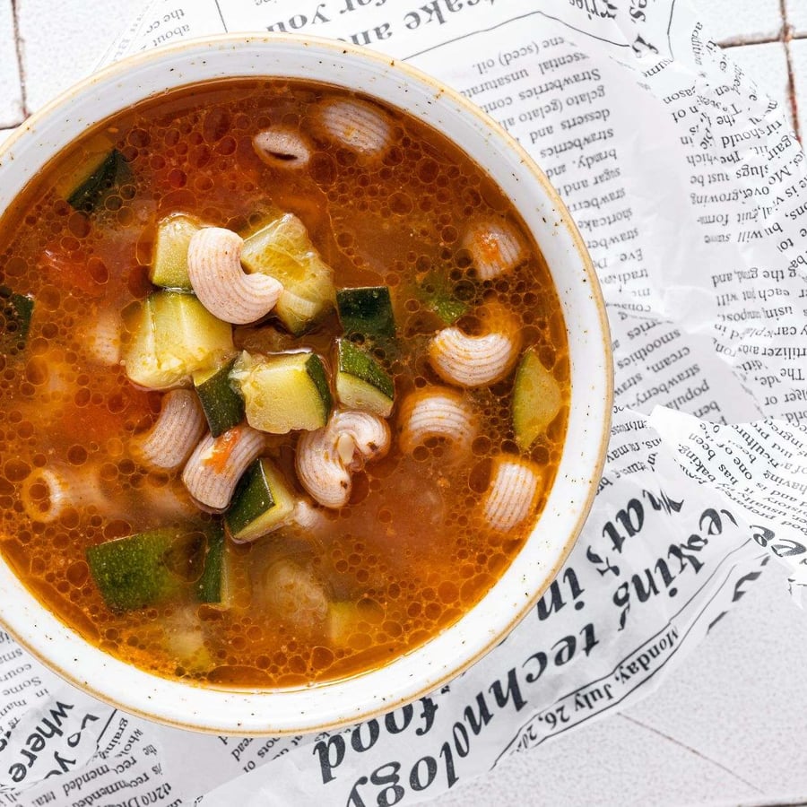 - 2Nyní si ve větším hrnci na středním plameni rozpalte 1 lžíci oleje, přidejte nakrájenou žlutou cibuli a opékejte 2–3 minuty. Poté přidejte prolisovaný česnek a nakrájenou cuketu a vše opékejte další 1–2 minuty na středním plameni. Následně do hrnce přilijte zeleninový vývar, plamen zvyšte na silný a obsah hrnce přiveďte k varu. Jakmile voda začne vřít, přisypte do hrnce těstoviny, nakrájenou červenou cibuli a rajče, snižte plamen na střední a vařte, dokud těstoviny nebudou měkké (zhruba 8–12 minut).