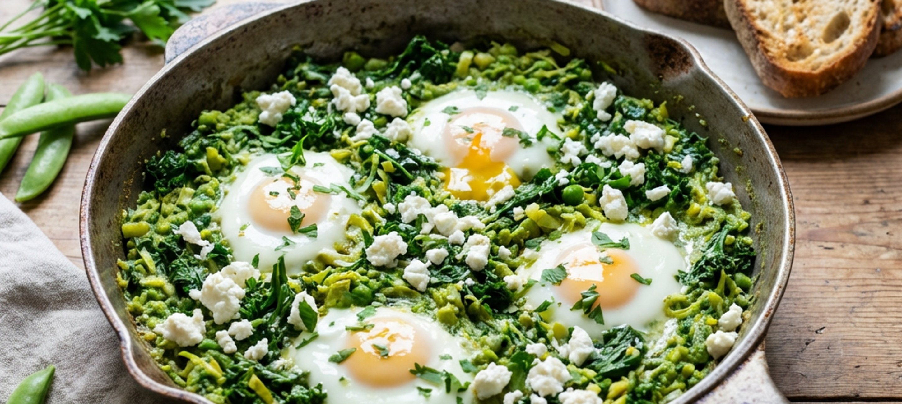 - 1Nyní si ve větší pánvi rozehřejte 1 lžíci řepkového oleje, přidejte cibuli a pórek a opékejte 3–4 minuty na středním plameni. Poté přidejte česnek a opékejte další 1 minutu. Následně přidejte rozmixovaný hrášek, cuketu a kapustu a vše vařte 2–3 minuty na středním plameni. Poté přidejte baby špenát a vařte další 1–2 minuty. Následně přidejte sůl a pepř, plamen snižte na mírný až střední, vytvořte ve směsi 4 důlky a do každého vyklepněte 1 vejce. Navrch rozdrobte balkánský sýr, pánev přiklopte pokličkou a vše vařte 4–6 minut, dokud se vejce neuvaří tak, jak je máte rádi. Mezitím si nakrájejte najemno petrželovou nať.