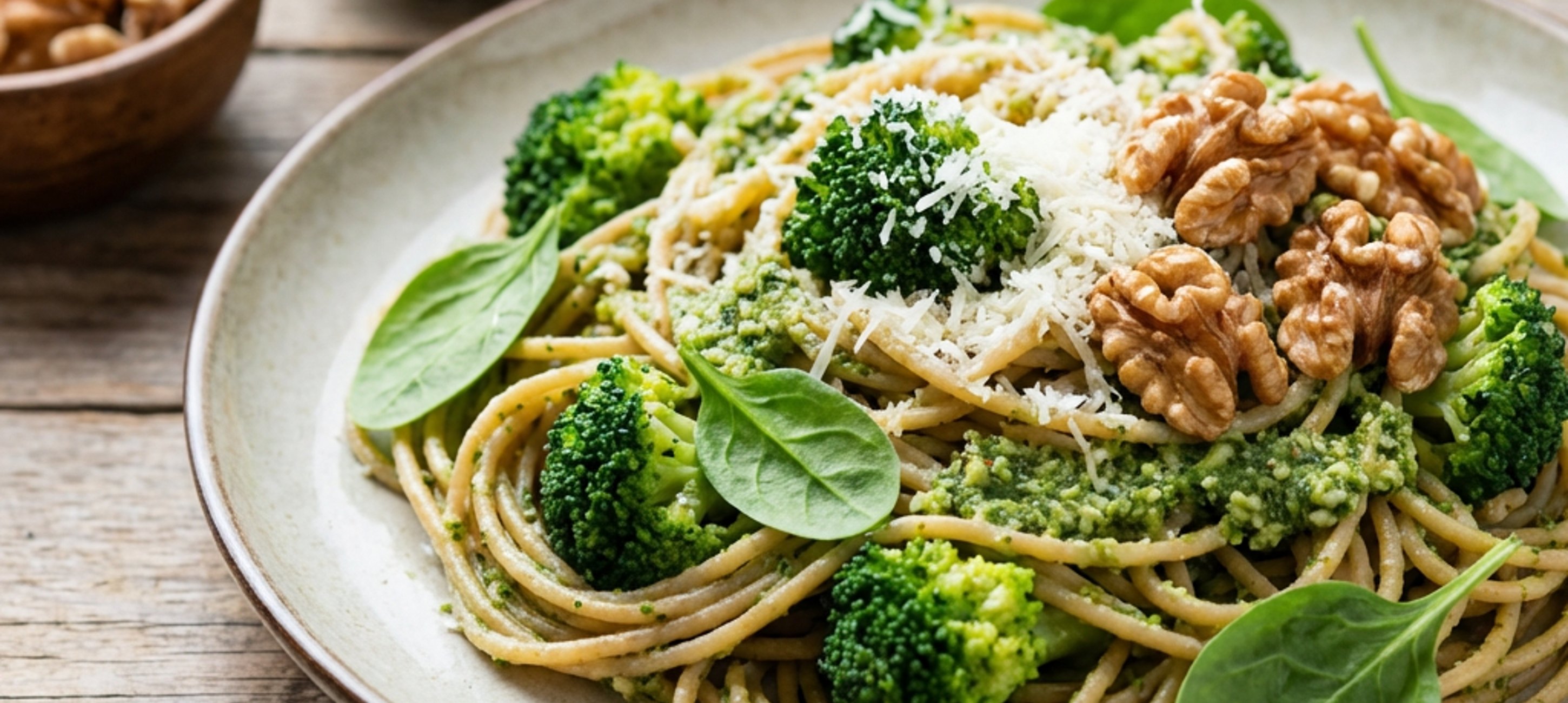 - 3Během vaření špaget si připravte pesto: Česnek oloupejte, vložte do mixéru a přidejte k němu strouhaný parmazán, vlašské ořechy, olivový olej, baby špenát, bazalku, citronovou šťávu, nakrájený brokolicový stonek, sůl, pepř a ½ celkového množství brokolicových růžiček. Poté obsah mixéru rozmixujte a výslednou směs podle potřeby dochuťte solí a pepřem.