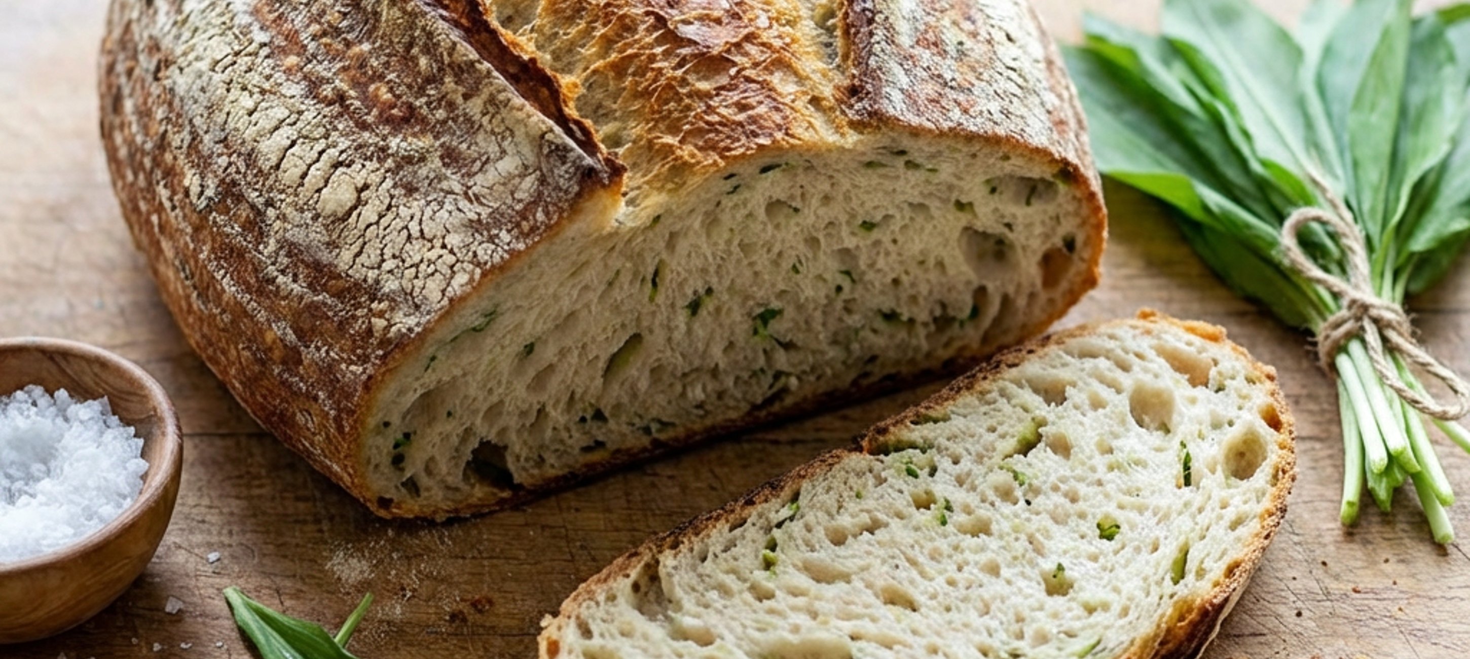 - 3Medvědí česnek nasekáme na menší kousky. Vykynuté těsto vyklopíme na pomoučený vál, roztáhneme je na placku, tu posypeme medvědím česnekem a srolujeme ji jako roládu. Okraje těsta přehneme nahoru a bochník vložíme do dobře pomoučené pedigové ošatky. Přikryjeme utěrkou a necháme kynout cca 2 hodiny na teplém místě, dokud těsto nezdvojnásobí svůj objem. Ošatku můžeme dát také do igelitového sáčku a umístit na celou noc do ledničky.