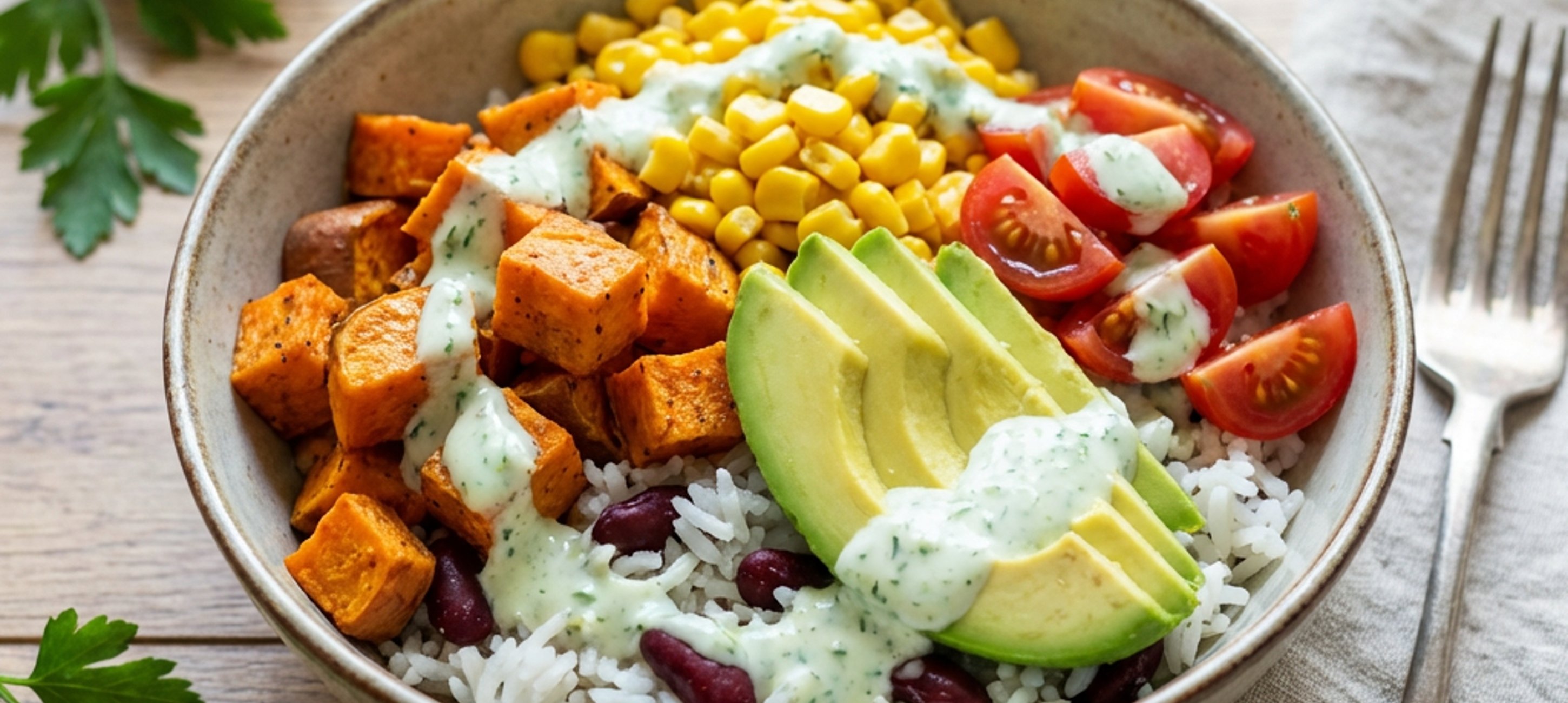 - 7Až se dopečou batáty, nachystejte si 3 misky a rozdělte do nich všechny ingredience kromě avokáda. Každou porci přelijte dresinkem, navrch dejte plátky avokáda a podávejte.