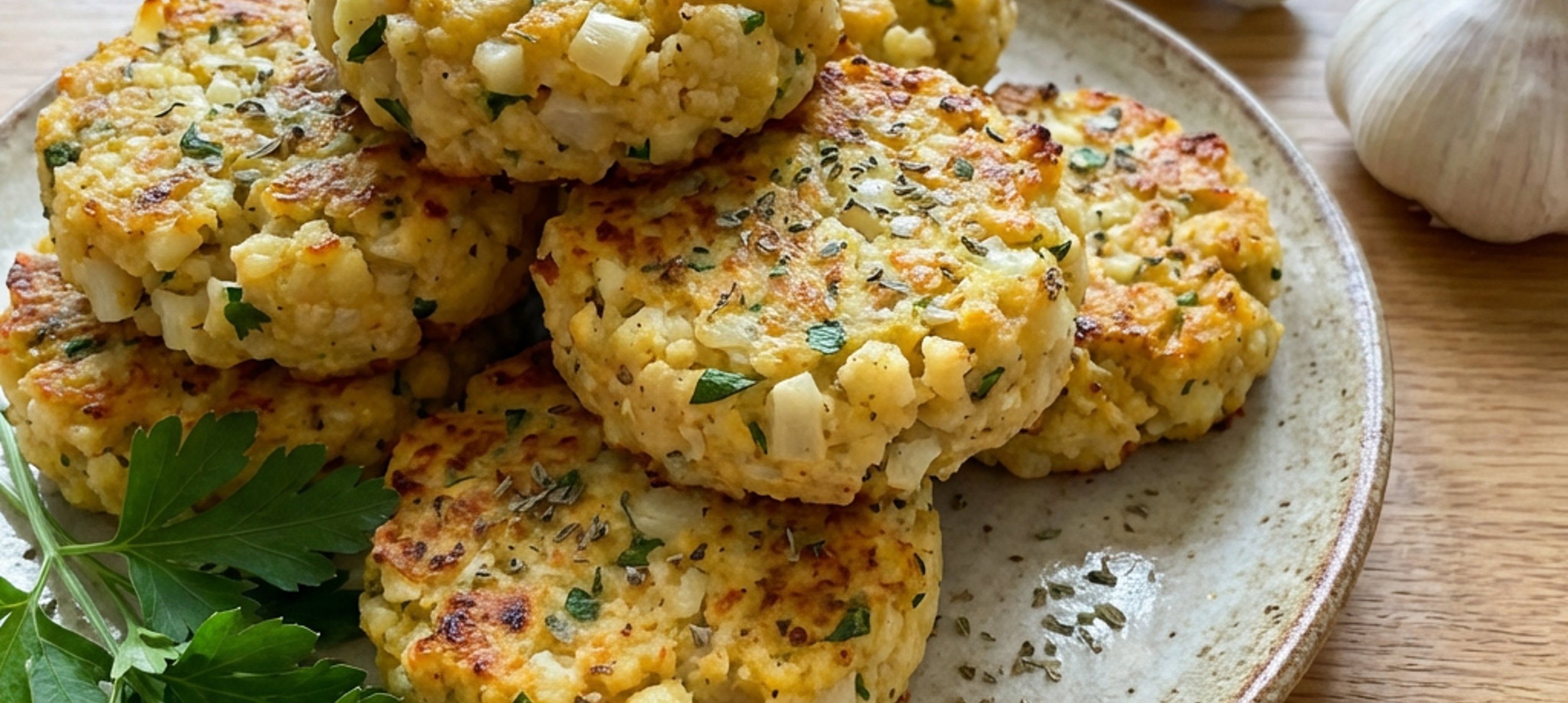 - 2Nyní si dejte předehřívat troubu na 190–195 °C a vyložte si pečicím papírem plech (30 cm × 40 cm). Do mísy ke květáku prolisujte oloupaný česnek, přidejte vejce, špaldovou mouku, sušenou majoránku, nasekanou petrželovou nať, sůl a pepř a vše promíchejte. Ze vzniklého těsta tvořte placky o průměru 10 cm a výšce cca 2 cm a pokládejte je na vyložený plech. Až zpracujete všechno těsto, dejte plech do trouby a pečte 40–45 minut při 190–195 °C. Upečené karbanátky ihned podávejte.
