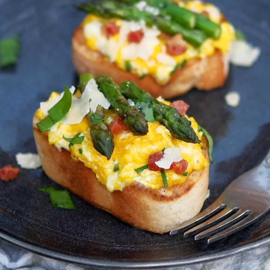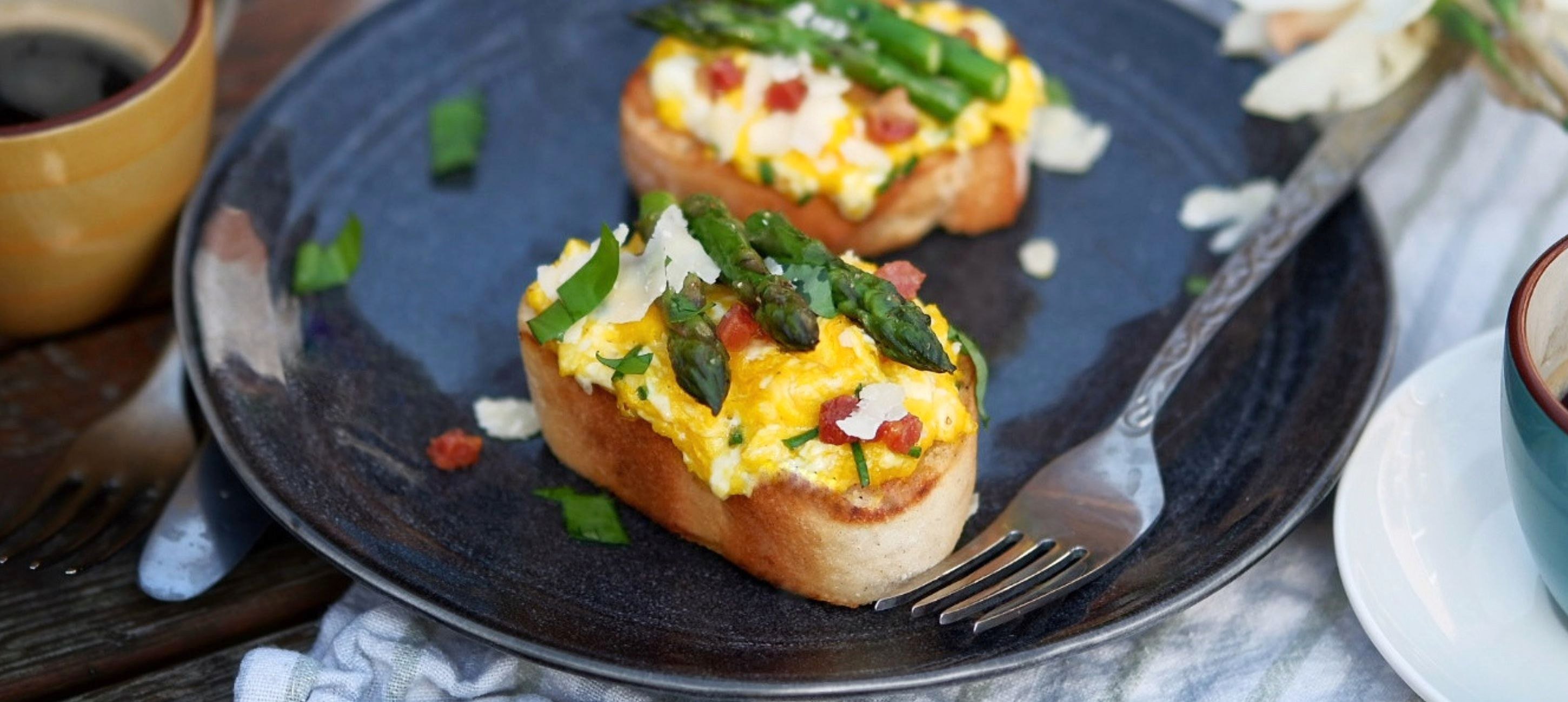 Place scrambled eggs, crispy pancetta, and asparagus on the crispy baguette. Sprinkle with Parmesan and chopped wild garlic.