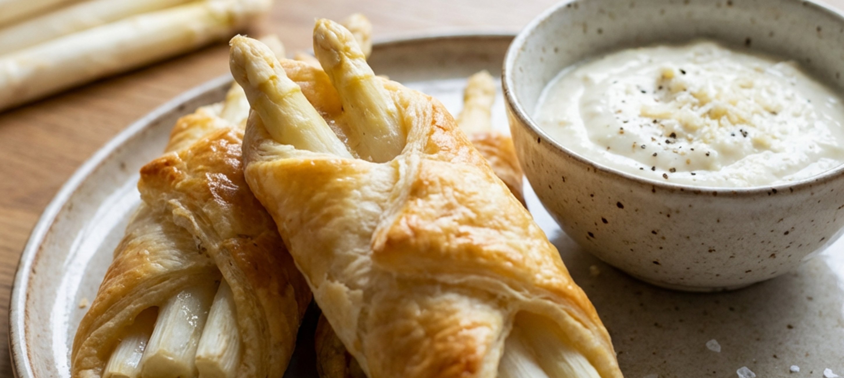 - 4Na obdélnik položte chřest tak aby špička vyčuhovala přes těsto. Jednu delší stranu těsta potřete žloutkem. Spodní, krátkou stranu těsta přehněte přes konec chřestu. Chřest osolte, opepřete a srolujte do těsta. Takto připravte všechny chřesty a dejte je na 10 minut do mrazáku.