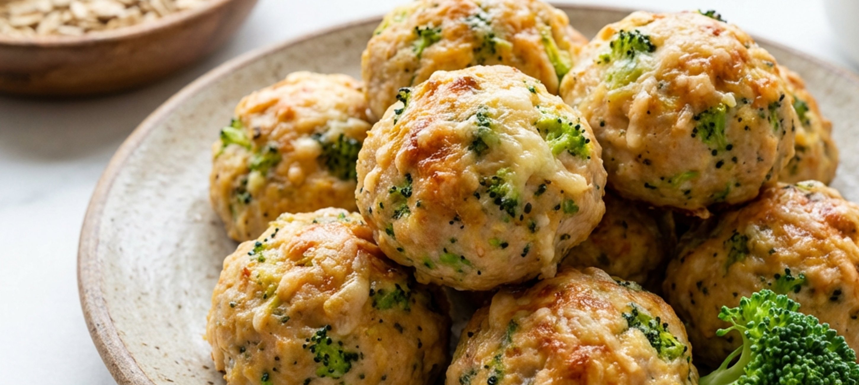 - 2Kuřecí prsa omyjte, osušte a nakrájejte na větší kostky. Cibuli oloupejte a nakrájejte na větší kousky. Brokolici včetně stonku nakrájejte na menší kousky. Parmazán nastrouhejte na jemném struhadle. Následně vložte nakrájená kuřecí prsa, cibuli, brokolici i nastrouhaný parmazán do mixéru, přidejte k nim žloutek, kari koření, ovesné vločky, mletý kmín, sůl a pepř a vše rozmixujte dohladka. Ze vzniklé směsi tvořte kuličky o hmotnosti cca 40 g a pokládejte je na vyložený plech.