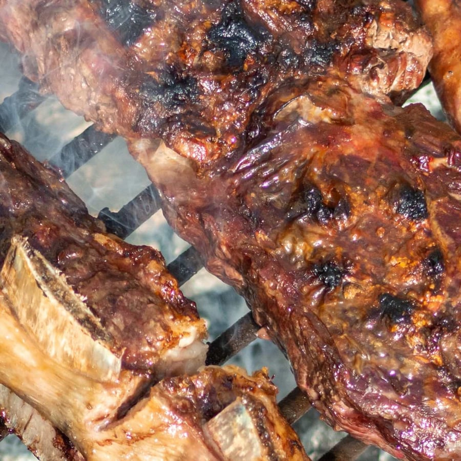 - 2Grilovací rošty lehce naolejujte. Grilujte odkryté a nerušené, dokud spodky žeber nezhnědnou a neuvolní se z roštu, 4 až 6 minut. Žebra otočte na odkrytý grl dokud nezhnědnou a teploměr vložený blízko kosti, ale nedotýká se jí, ukazuje 55 °C, 2 až 4 minuty. Poté sundejte z grilu a nechte 5 až 10 minut odpočívat.