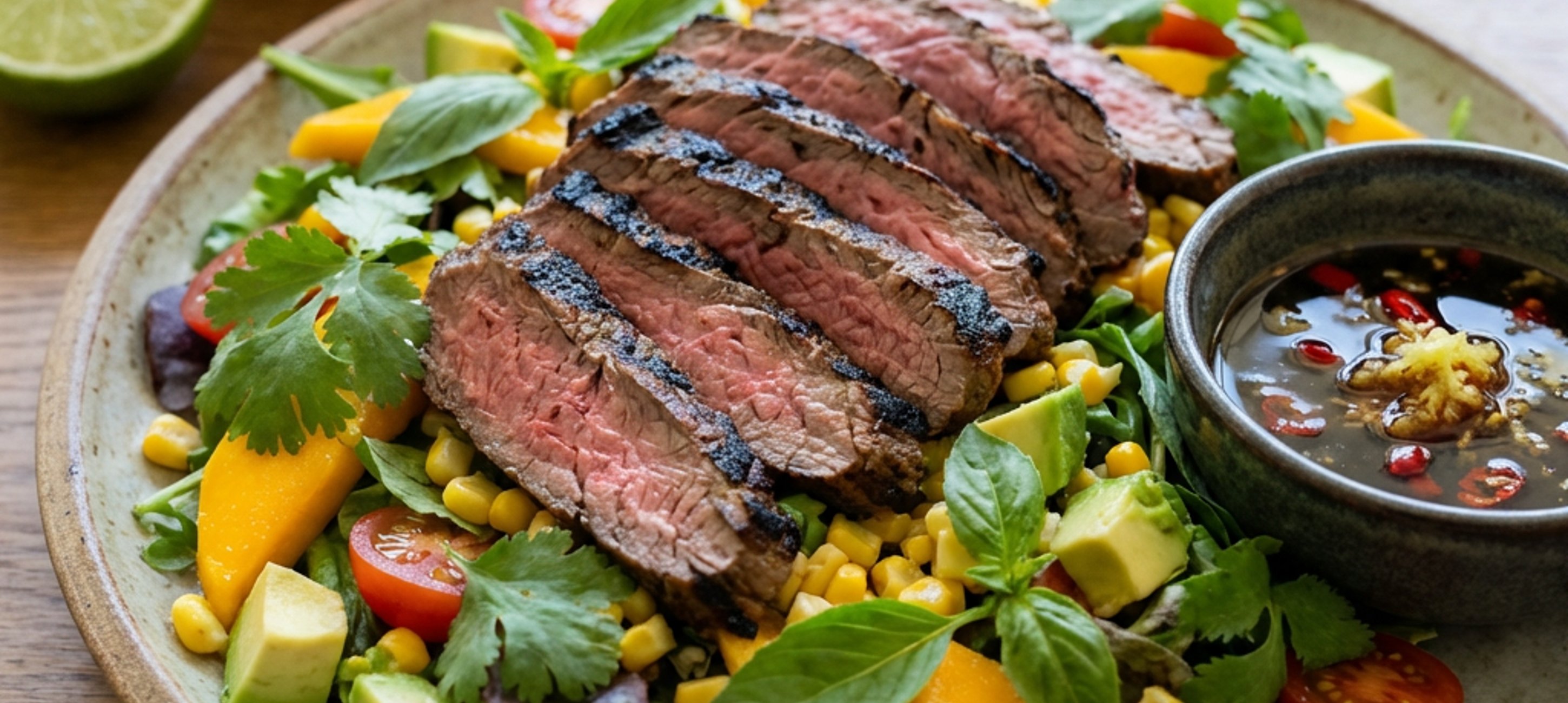 - 5Zálivku přelijeme přes salát a jemně promícháme, aby byl salát rovnoměrně ochucený. Na talíře rozdělíme salát a na vrch poklademe plátky grilovaného flank steaku.
