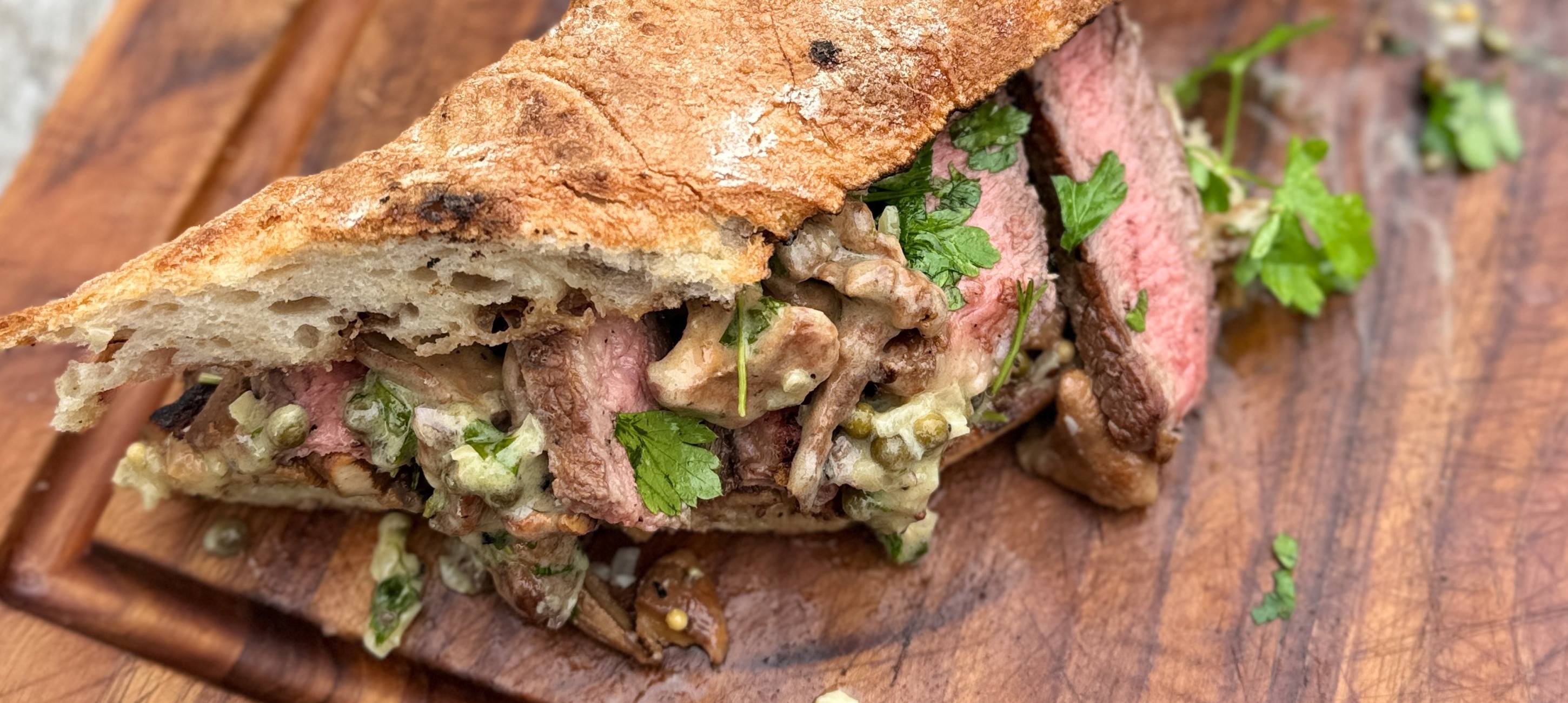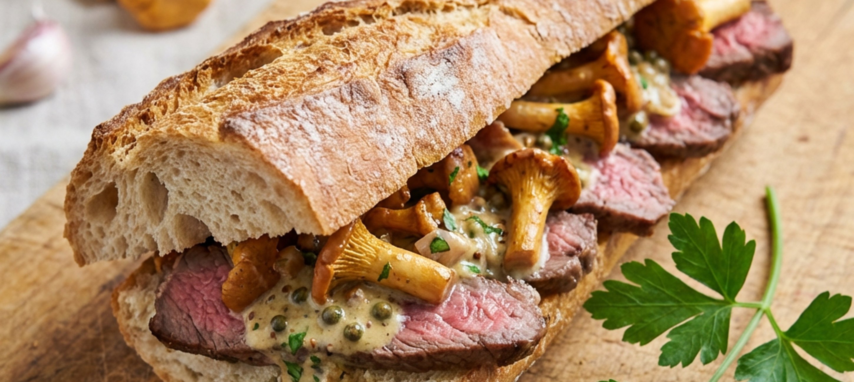 - 7Bagetu rozpulte, potřete máslem a opečte na grilu. Na opečenou bagetu dejte liškovou směs a odpočatý, na tenké plátky nakrájený steak.