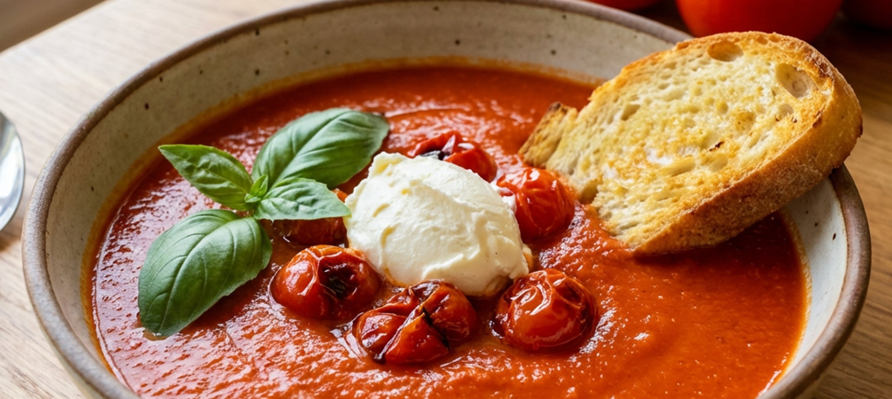 - 4Rozmixovanou polévku přendáme do talíře, přidáme opečená rajčátka, čerstvou bazalku mascarpone, parmezán a na másle opečený plátek ciabaty.
