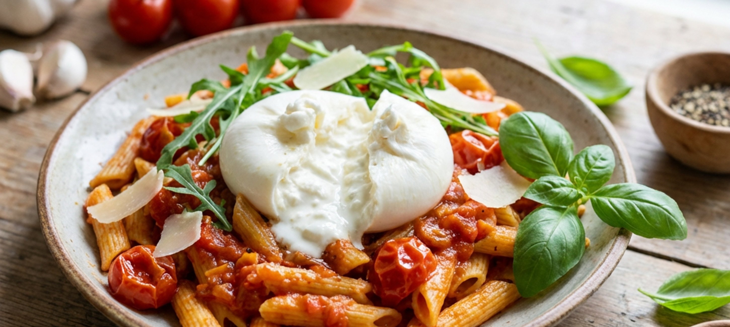 - 4Na těstoviny roztrhneme celou burratu, pokapeme olivovým olejem, opepříme a pohodíme rukolu a parmezán.
