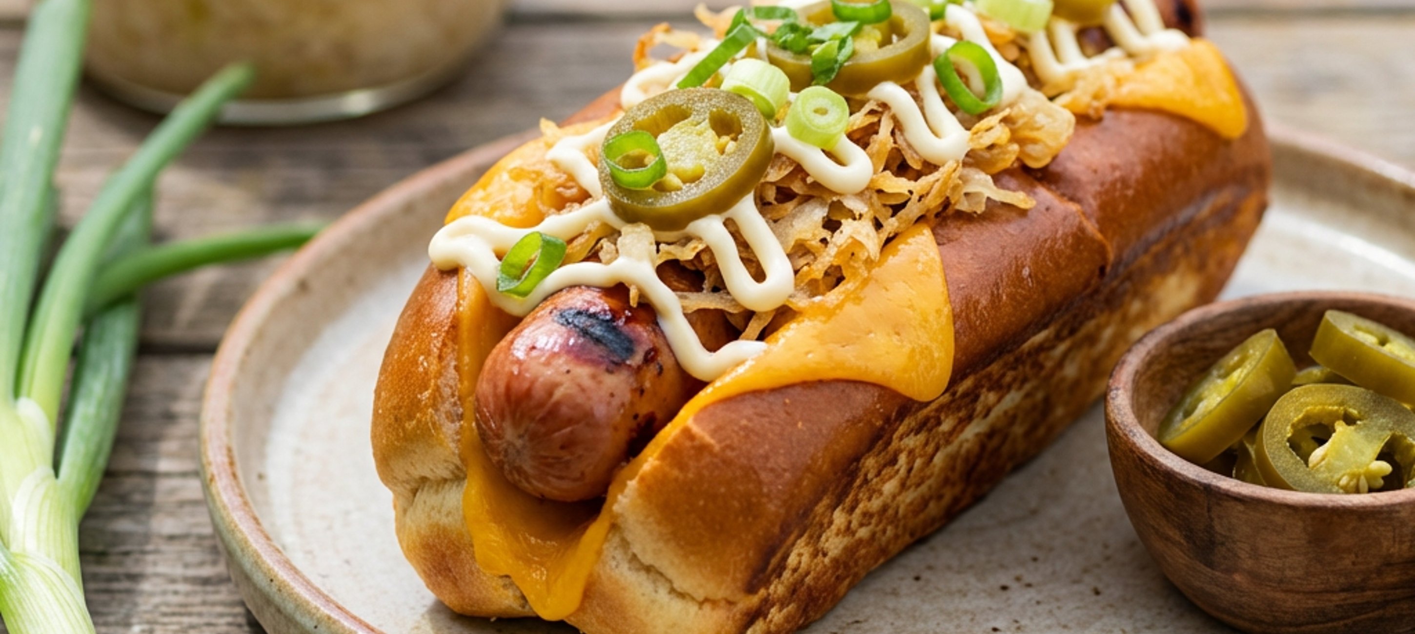 - 5Poté je z trouby vytáhněte, dovnitř dejte kouky smaženého zelí, slaninu a párek. Přidejte kousky zelí i navrch. Poté pocákejte majonézou a ozdobte nasekanými jalapenos a jarní cibulkou.