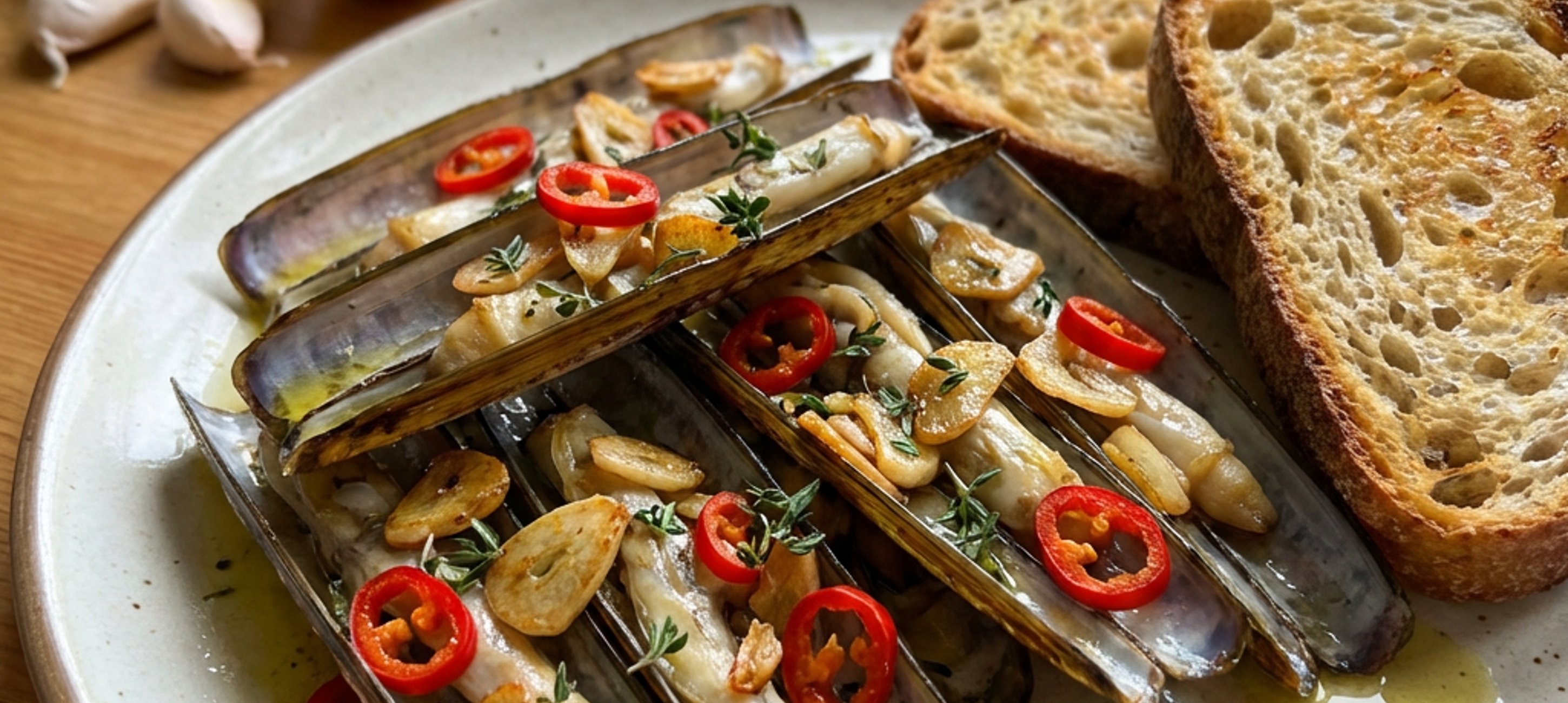 - 4Pečeme tak dlouho dokud se všechny břitký neotevřou. Trvá to přibližně 5 minut. Upečené přesuneme na talíře, polijeme omáčkou z plechu a zakápneme citronovou šťávou a olivovým olejem. Podáváme s pečeným kváskovým chlebem.